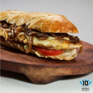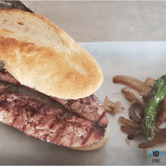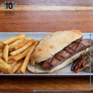 Baguette de arrachera el diez con tocino, queso, cebolla preparada, lechuga, jitomate y guarnición de papas a la francesa.