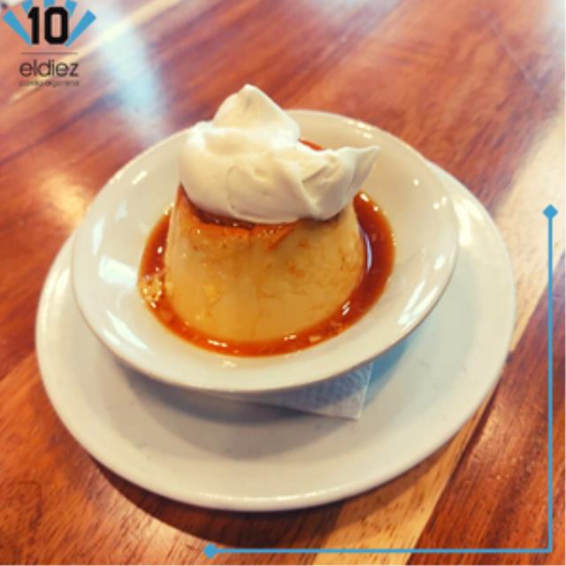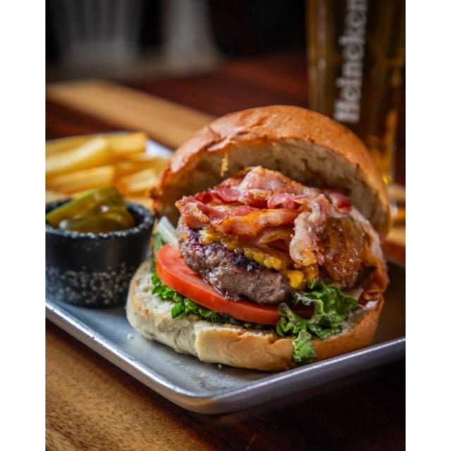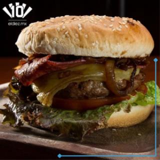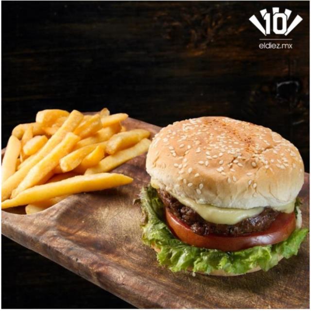 Hamburguesa el diez con lechuga juliana, jitomate, tocino, queso, cebolla preparada y guarnición de papas a la francesa.