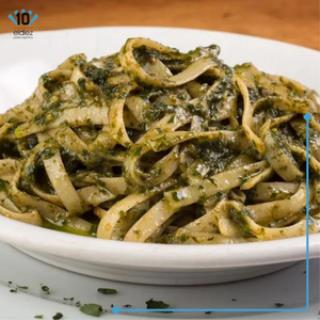 Pasta fresca amasada con salsa de albahaca, ajo, piñones y aceite de oliva
