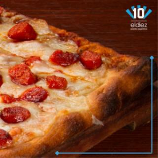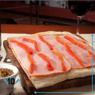 Salsa de tomate, queso mozzarella, pimiento morrón y jamón.