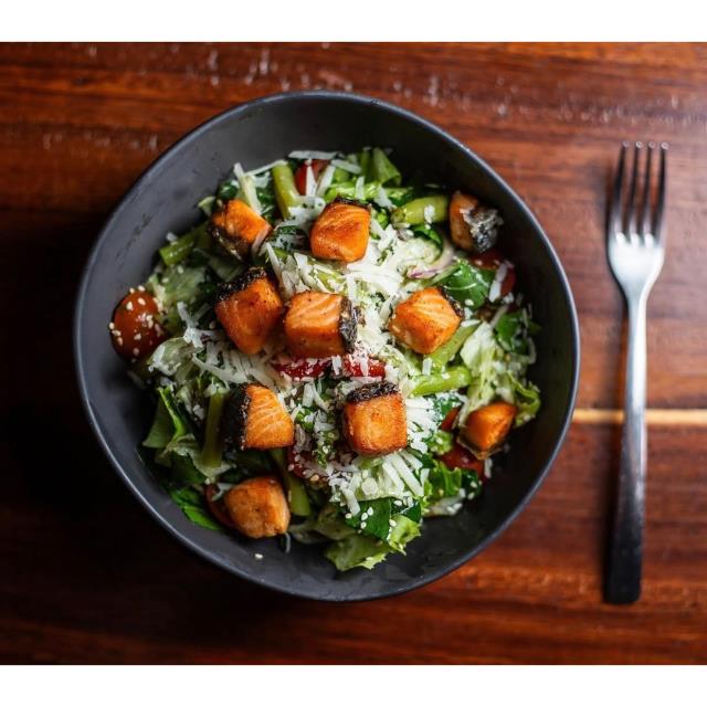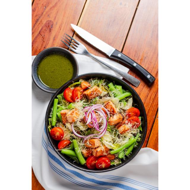 Salmón a la plancha, espinaca, lechuga romana, italiana y sangría, cebolla morada, ejote, parmesano, ajonjolí, jitomate cherry y vinagreta de albahaca