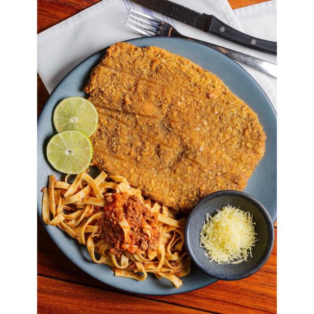 Milanesa de New York acompañada de pasta tagliatelle al burro con parmesano.