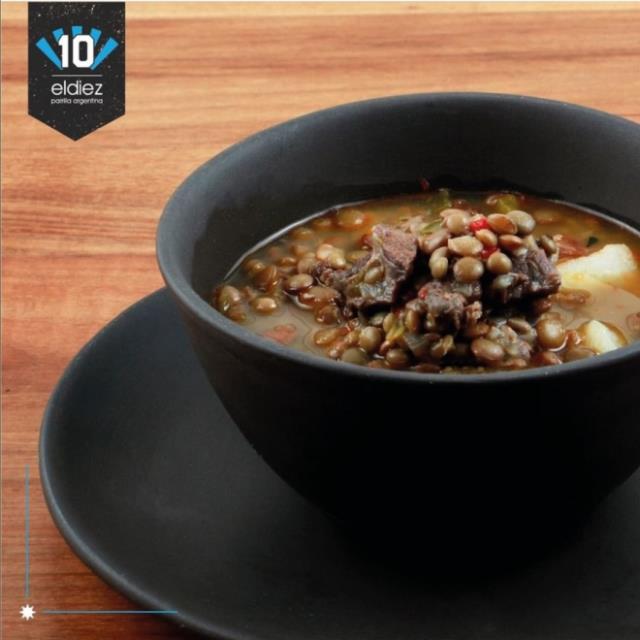Sopa de lentejas con trocitos de tocino, verduras y carne de res