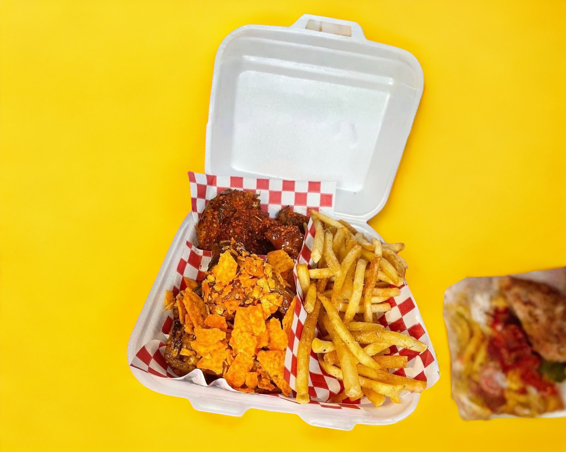 5 costillitas de cerdo más 5 alitas, bañadas en tu salsa favorita, acompañadas de papas a la francesa