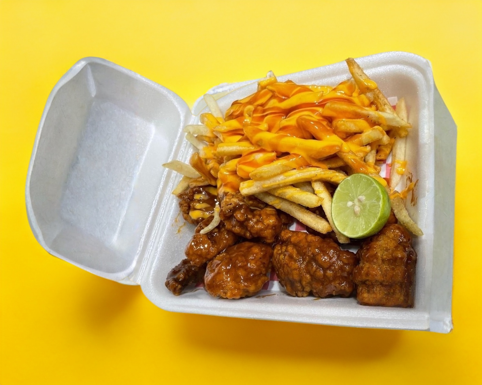 5 costillitas de cerdo + 5 boneless de pollo bañados en tu salsa favorita acompañados de papas a la francesa