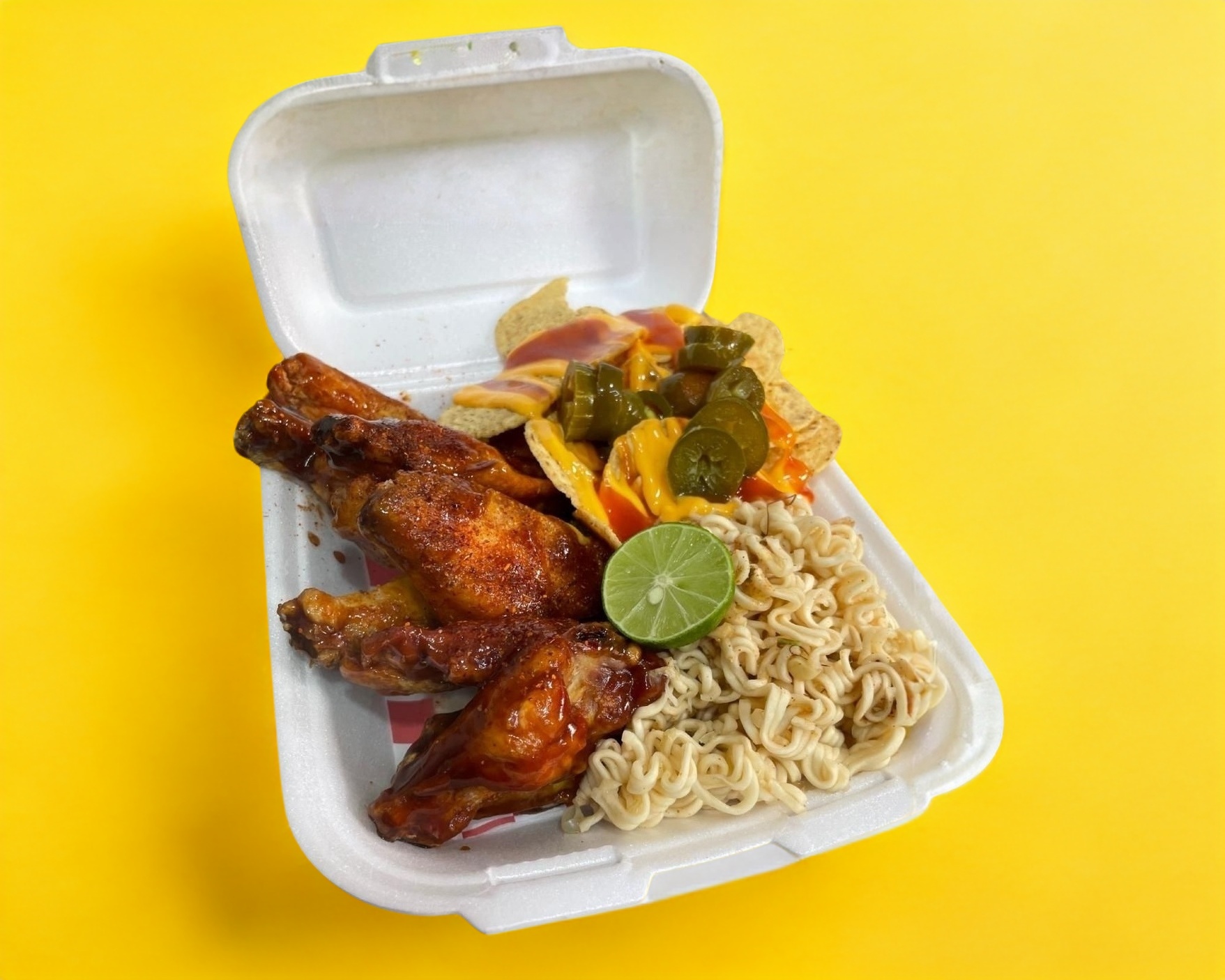 Seis costillas acompañadas de nachos con queso y sopa Maruchan en un Domo con salsas y aderezos
