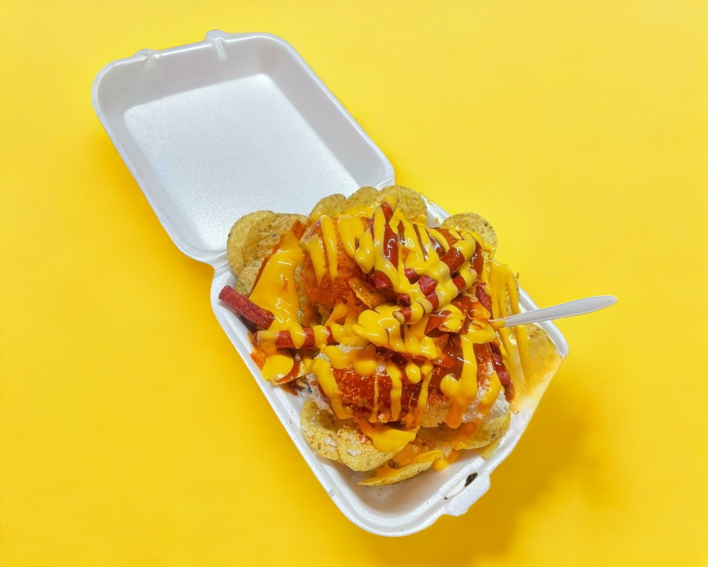 Elote cubierto con sus papás favoritas sobre una cama de esquites y ramen, Mayonesa, queso rallado, tostitos, Doritos y takis. Con una gran variedad de aderezos a elegir