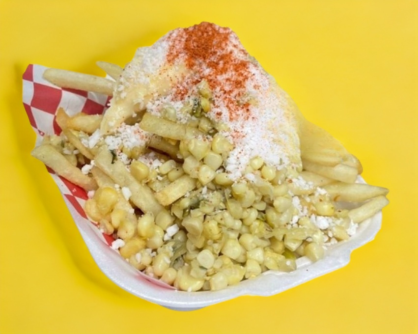 Papas a la francesa acompañadas de esquites preparados con mayonesa, queso, queso amarillo, piquín y limón