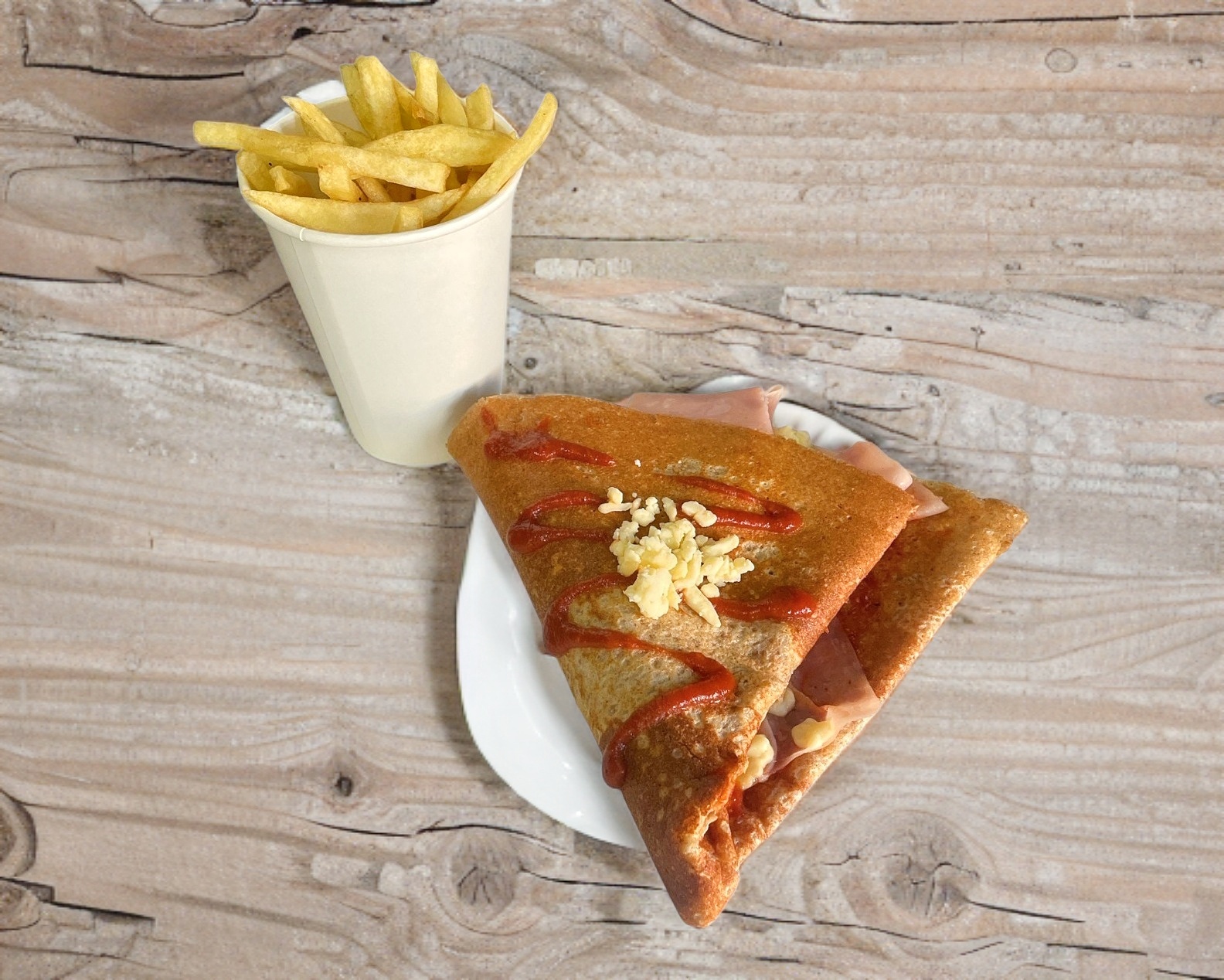Delicada crepa francesa rellena con la combinación de dos ingredientes a tu elección, perfecta para crear tu mezcla favorita.