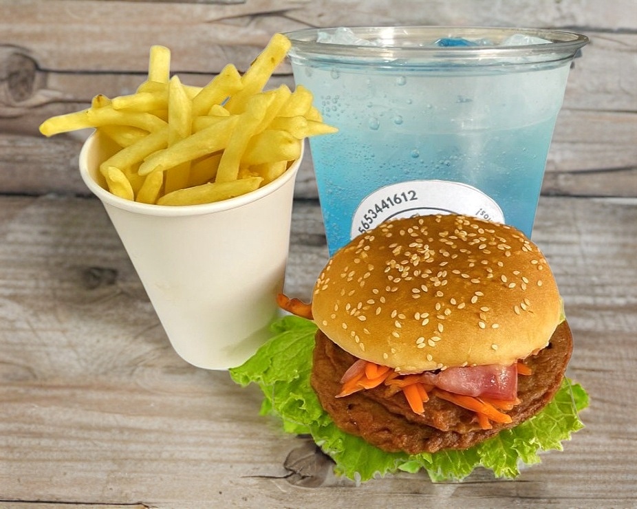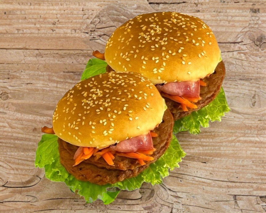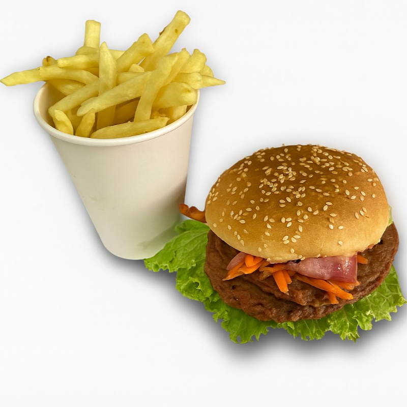 2 Jugosas carnes de res a la parrilla en pan suave, acompañada de lechuga, zanahoria, pepino, tocino aderezo a escoger. Servida con crujientes papas a la francesa.