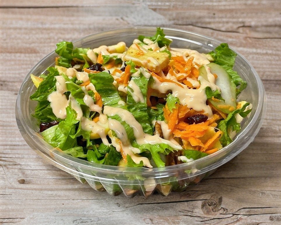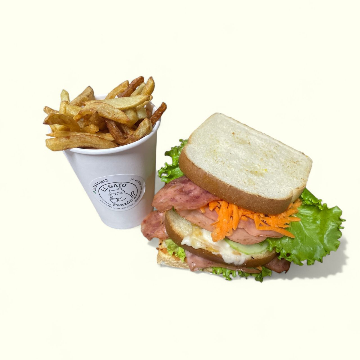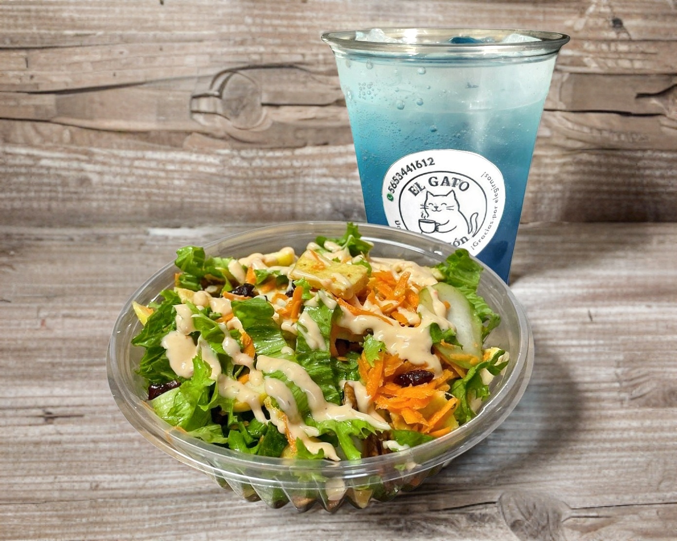 Pechuga de pollo, zanahoria, jamon, pepino, lechuga, tocino con papas a la francesa. y aderezo a escoger
