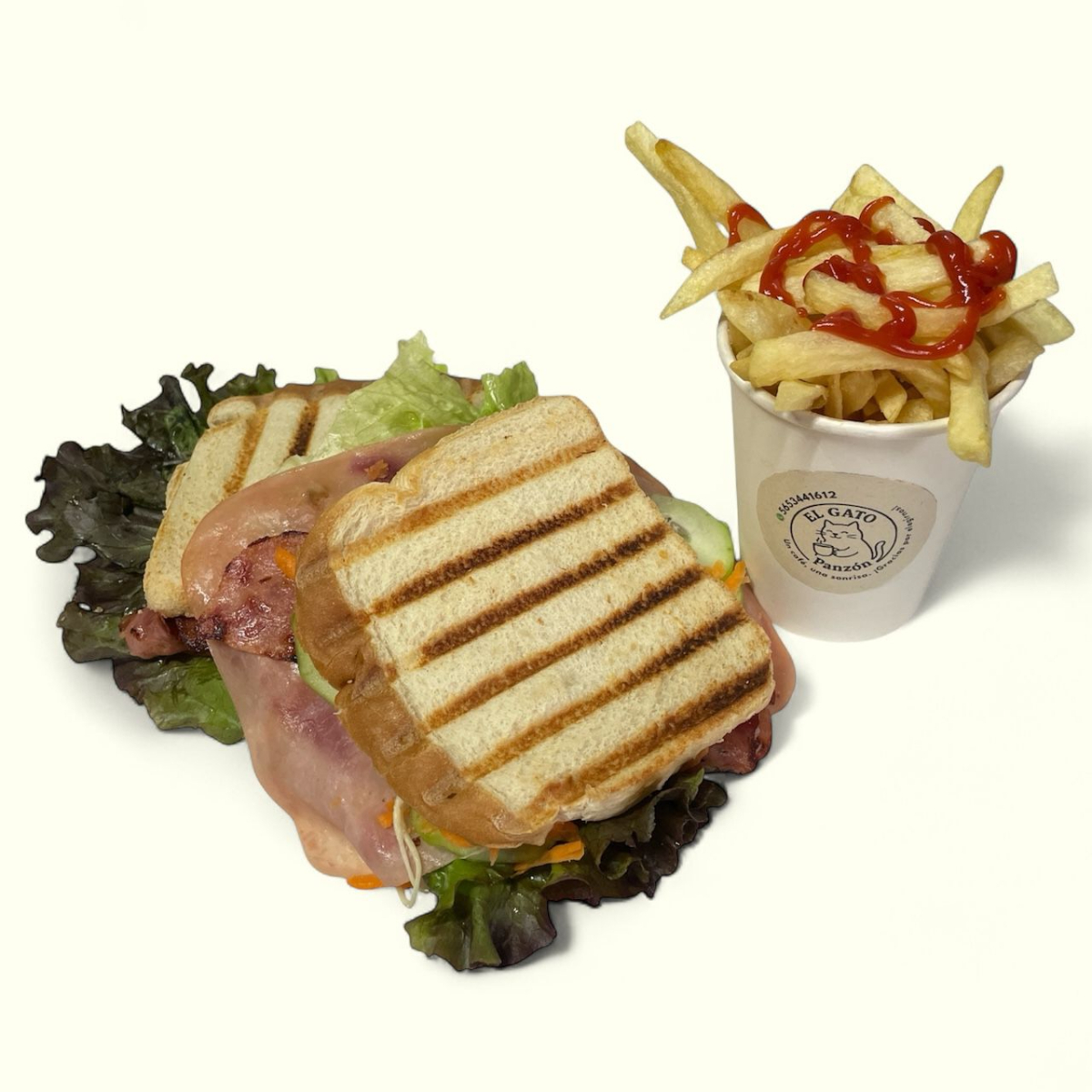2 Jugosas carnes de res a la parrilla en pan suave, acompañada de lechuga, zanahoria, jamon, piña, pepino, tocino y aderezo a escoger. Servida con crujientes papas a la francesa.