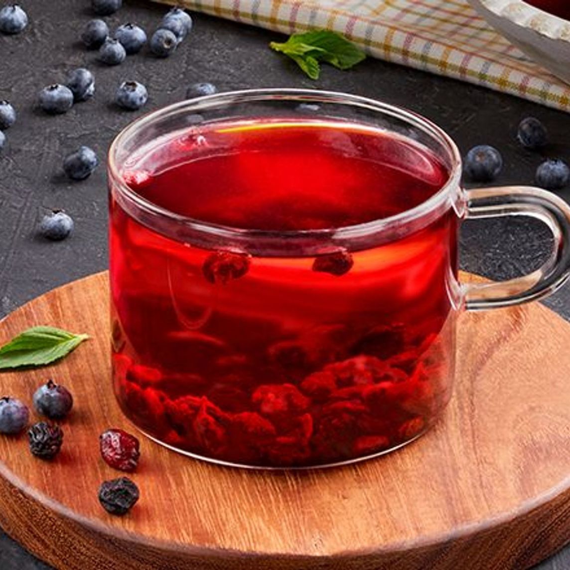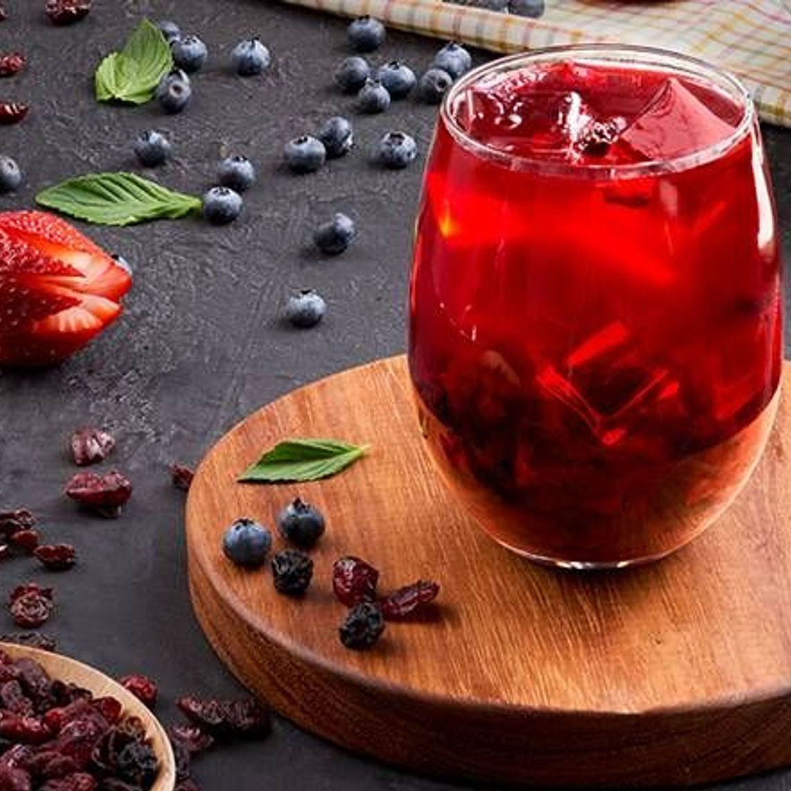 Deliciosa bebida elaborada a base de una combinación de frutos rojos (arándano, uva pasa, mora azul y fresa), flor de hibisco, escaramujo deshidratado y saborizante natural.