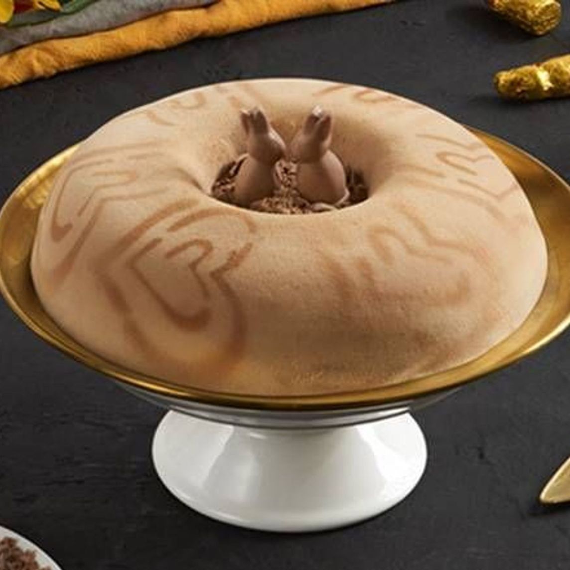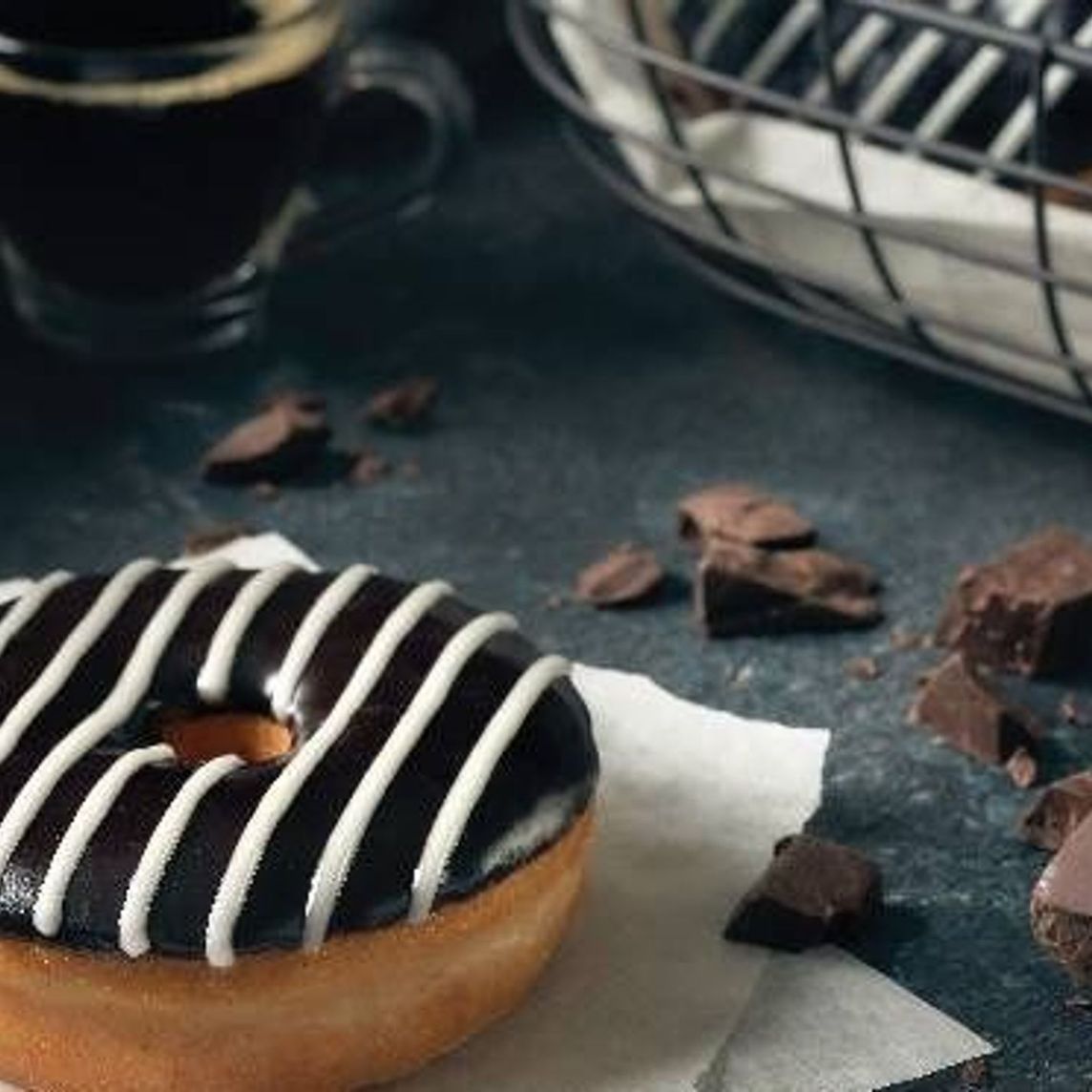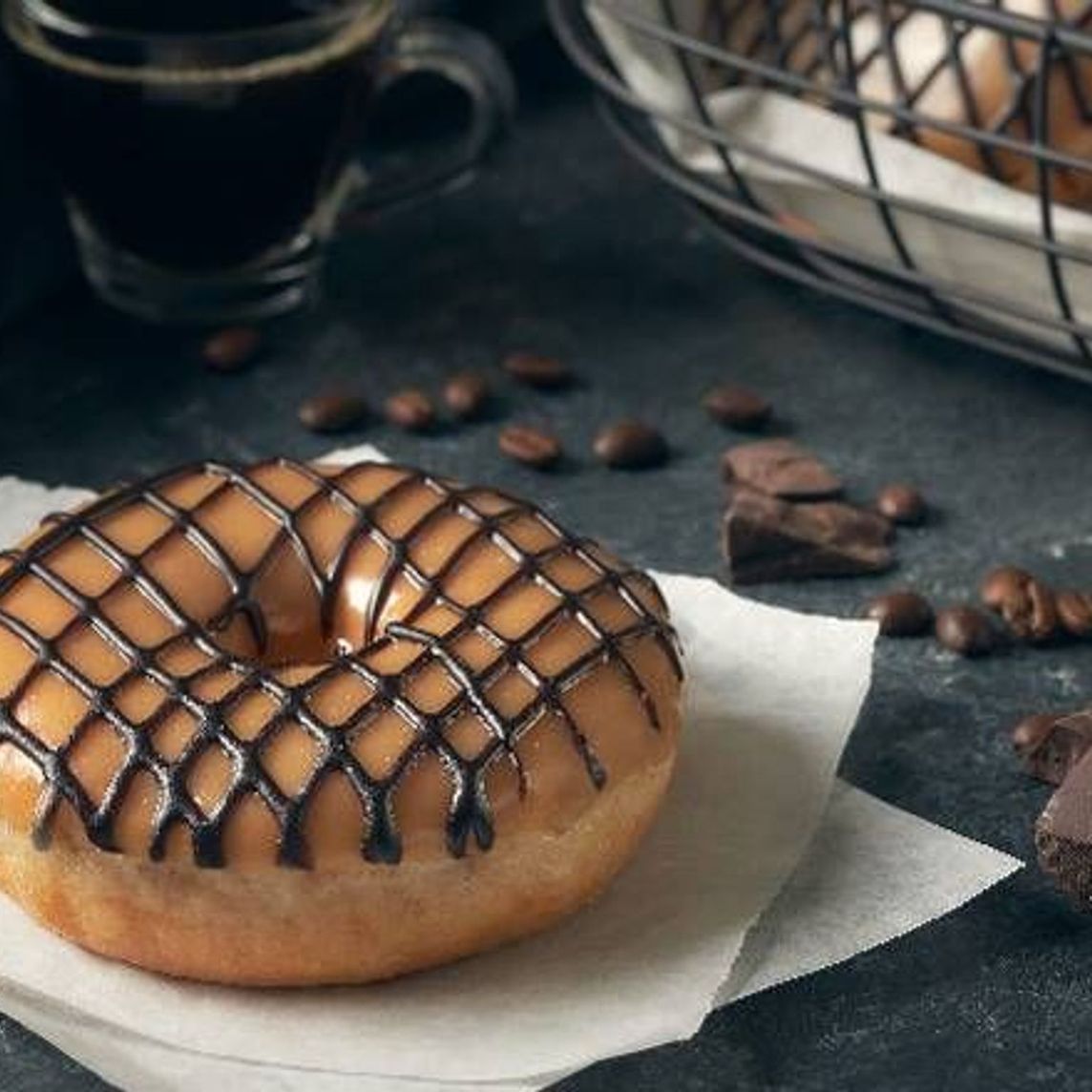 Dona francesa de vainilla decorada con sabroso fondant de moka y finas líneas de cobertura de chocolate.