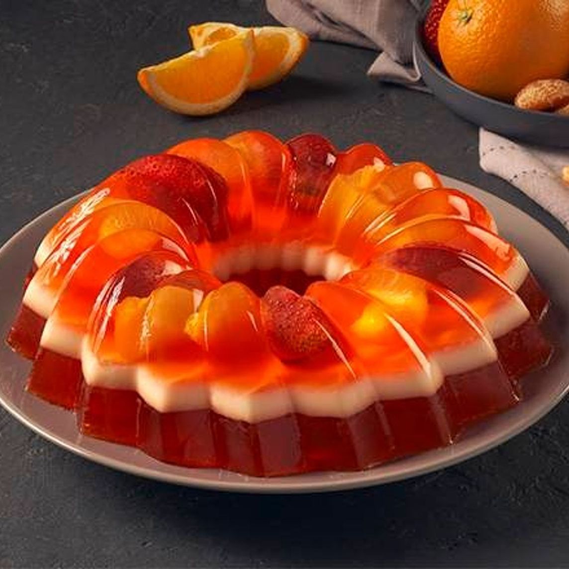 Gelatina de agua sabor naranja, combinada con una capa de gelatina de vainilla y decorada con fruta.