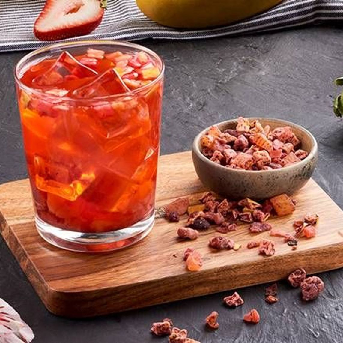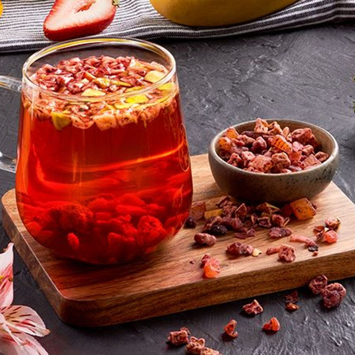 Deliciosa bebida elaborada con una exquisita combinación de fresa, arándano, manzana y pétalos de rosa deshidratados, ricos en antioxidantes, que por su frescura y aroma crea una experiencia para enamorarse.