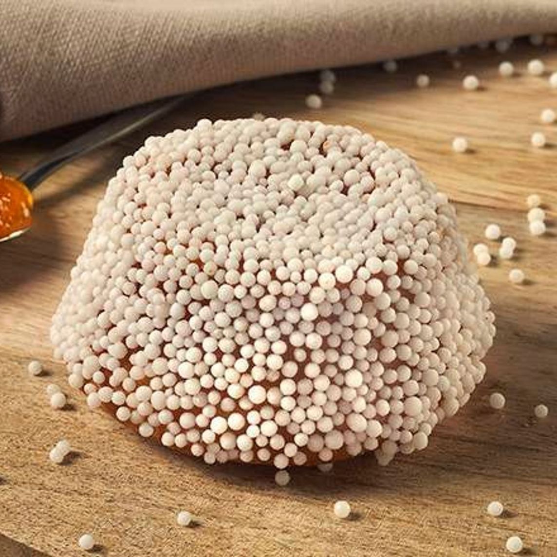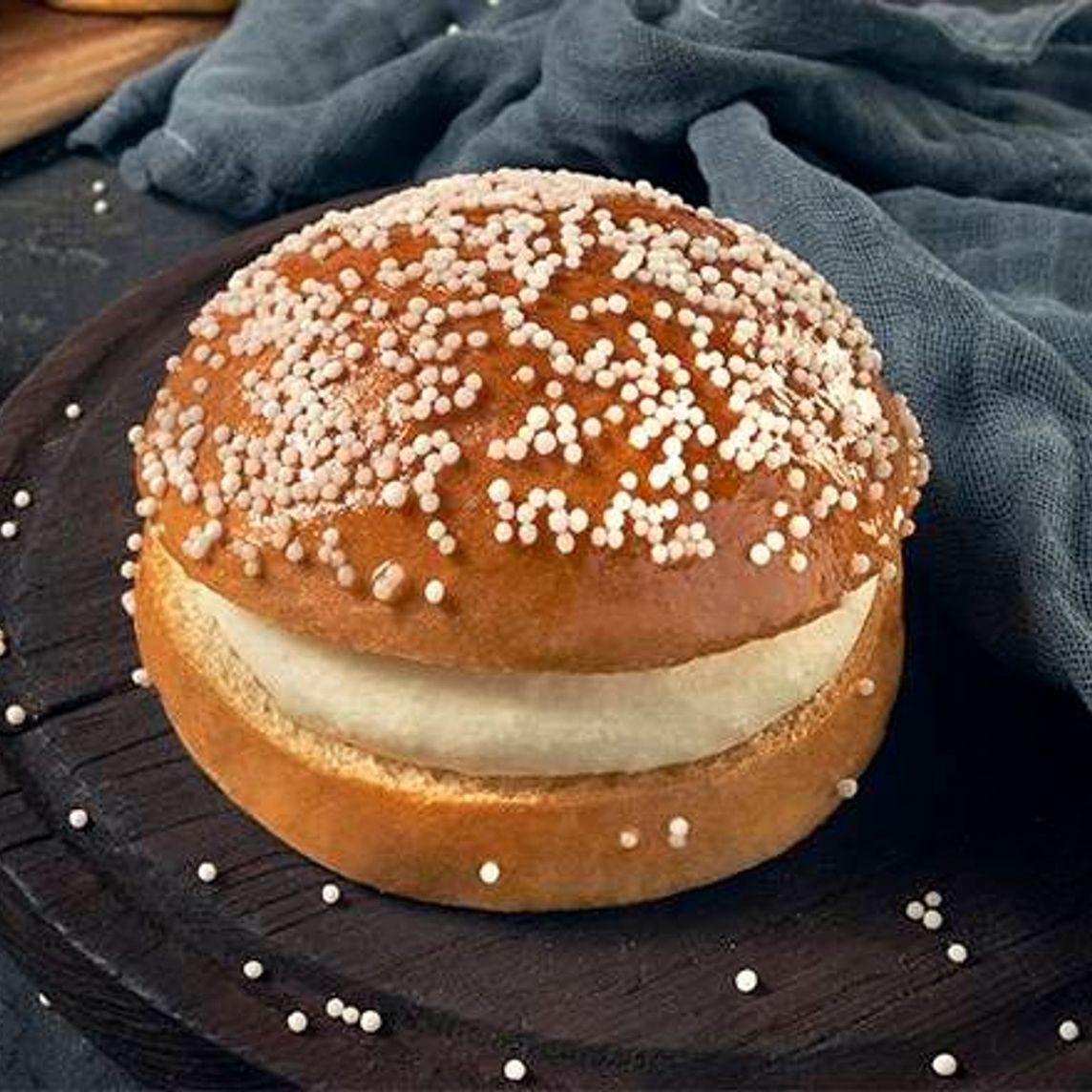 Único pan inspirado en el clásico postre tropézienne, con un toque de azahar y cáscara de naranja confitada en un delicioso pan elaborado con mantequilla de miga suave y esponjada, bañado con un ligero toque aromático de jarabe de marrasquino y relleno con una delicada crema de nata, decorado con pequeñas grageas de azúcar.