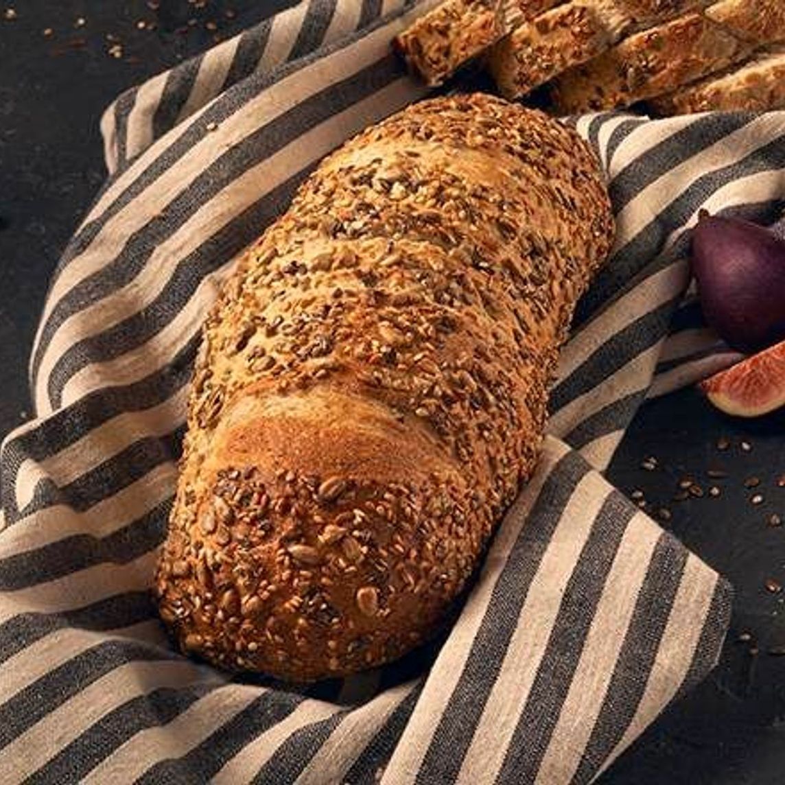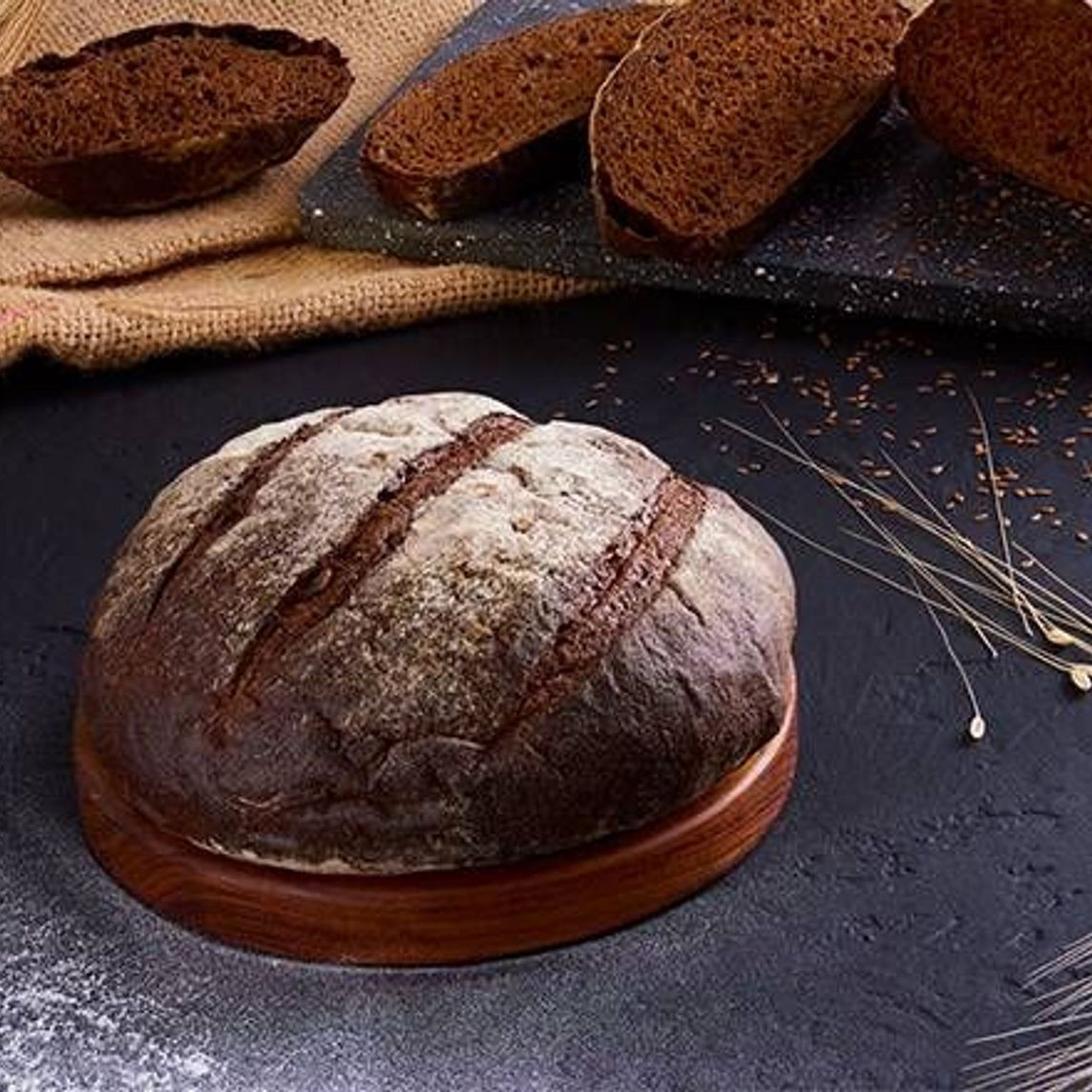 Pan rústico de centeno negro elaborado con masa madre, con semillas embebidas, perfil de sabor amargo y notas de cereales. Miga semi compacta y suave con corteza firme