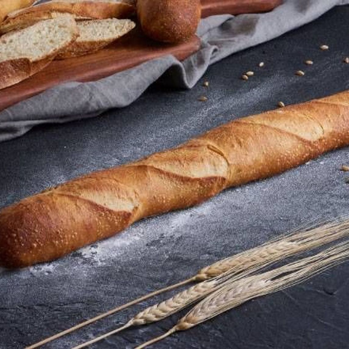 Baguette blanca rústica elaborada con masa madre, con buena apertura de miga, corteza crujiente y notas ácidas.