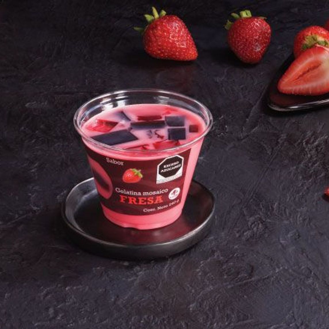 Gelatina de leche sabor fresa con cubos de gelatina de agua sabor limón, naranja, fresa y uva. Tamaño individual