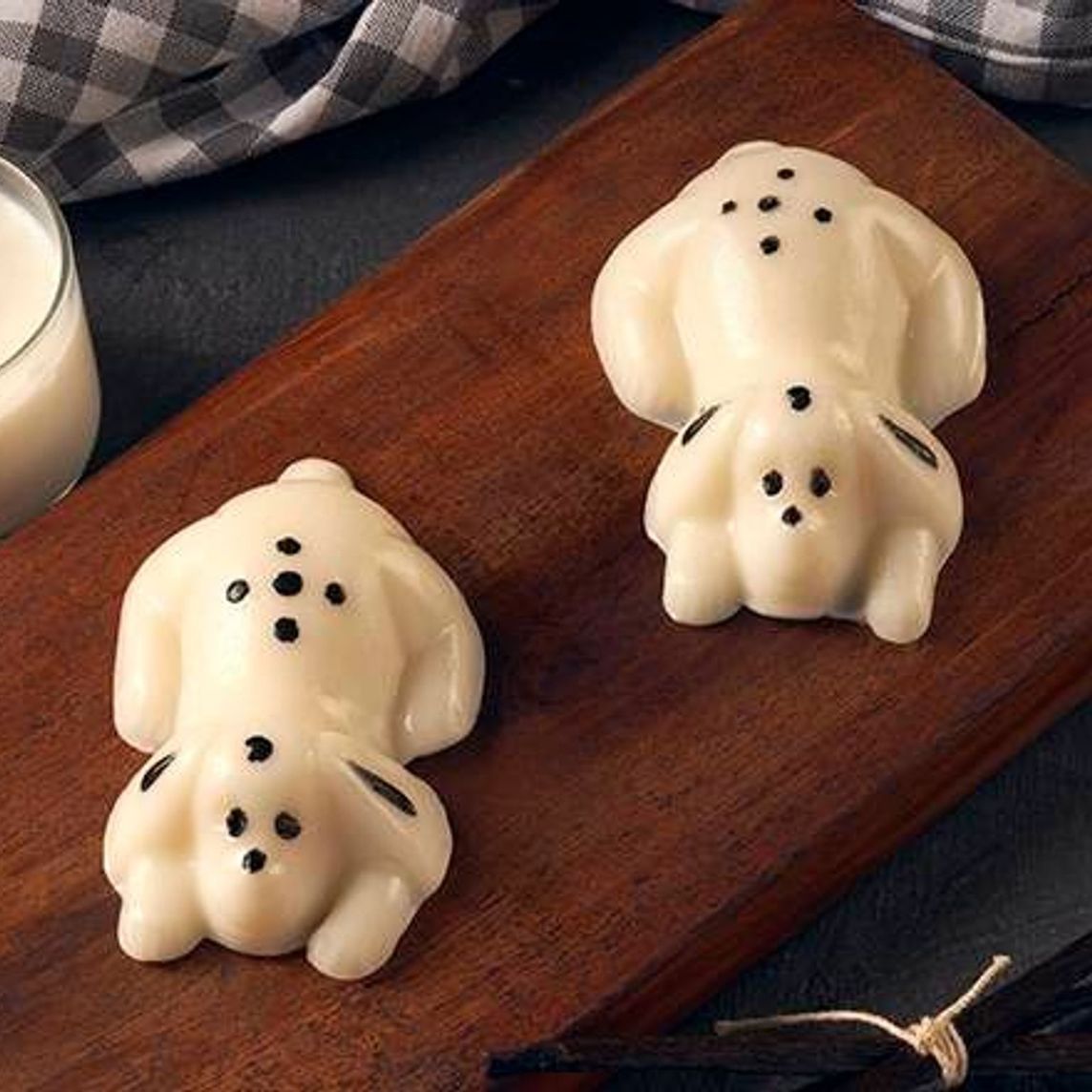 Clásica gelatina de leche individual sabor vainilla en forma de perrito dálmata.