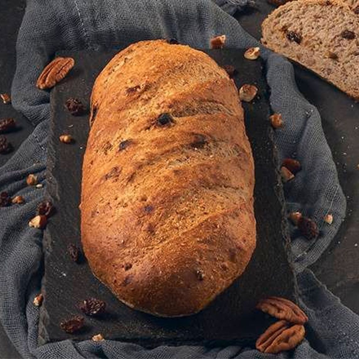 250 g. Pan de especialidad rústico, elaborado con nueces, pasas y harina integral.