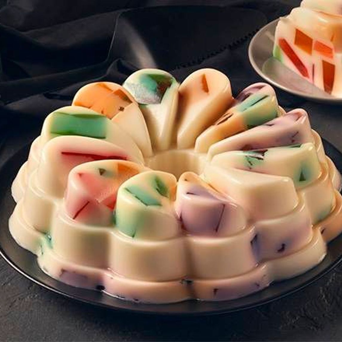 Gelatina de leche en forma de flor, sabor vainilla con cubos de gelatina de agua sabor limón, naranja, fresa y uva. 1.8 Lt.