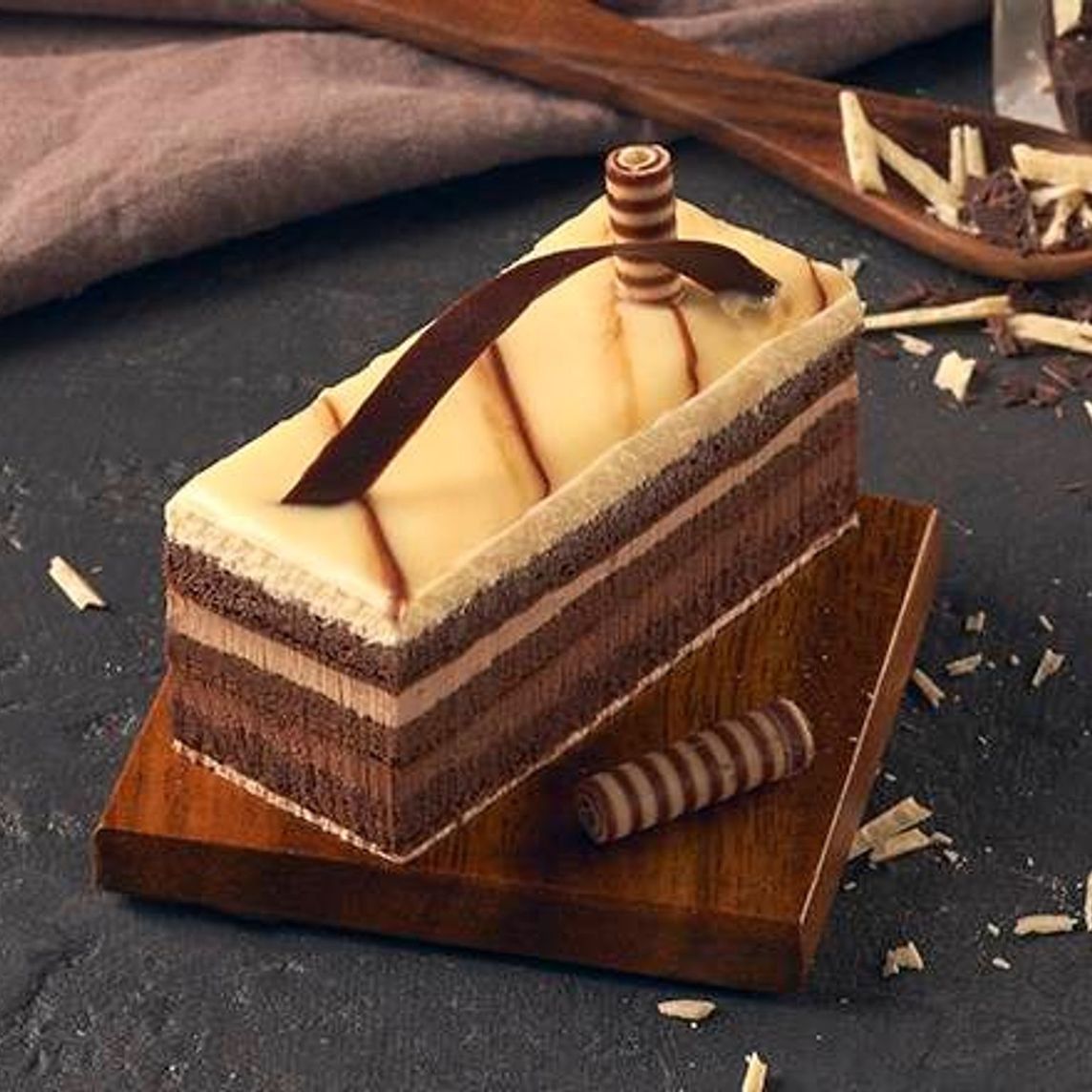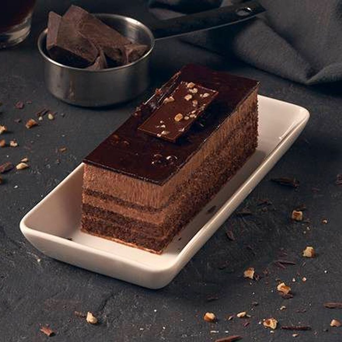 Pan de chocolate, relleno con exquisito mousse de chocolate amargo, chocolate de leche y chocolate blanco. (102 g)