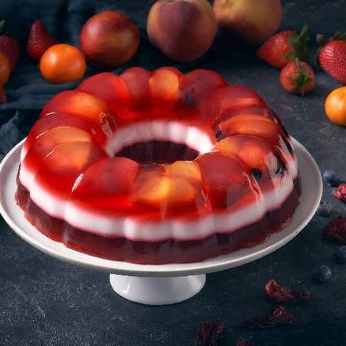 Gelatina de agua sabor fresa, combinada con una capa de gelatina de vainilla y decorada con frutas.