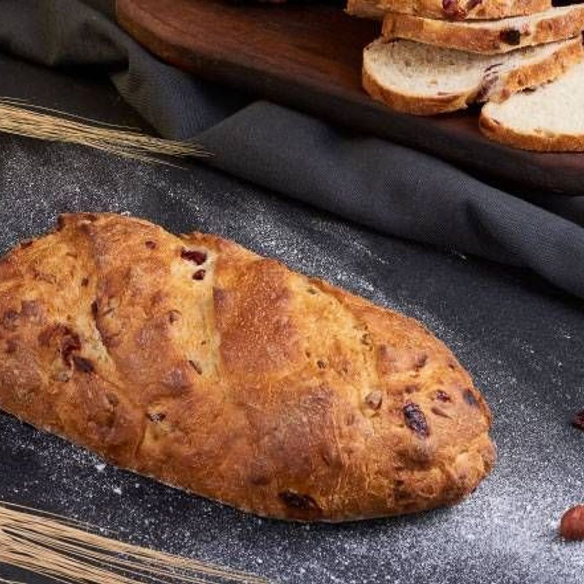 Pan rústico elaborado con Masa Madre, avellanas y arándanos. Corteza crujiente con sabor salado pero predominantemente dulce, con avellanas y arándanos visibles incrustados en la masa.