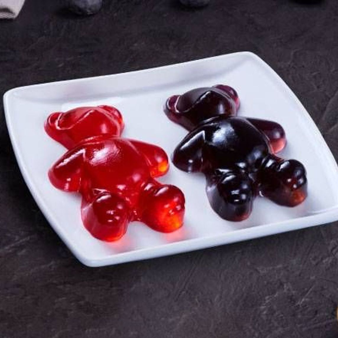 Gelatina de agua con forma de ositos sabor grosella y uva.