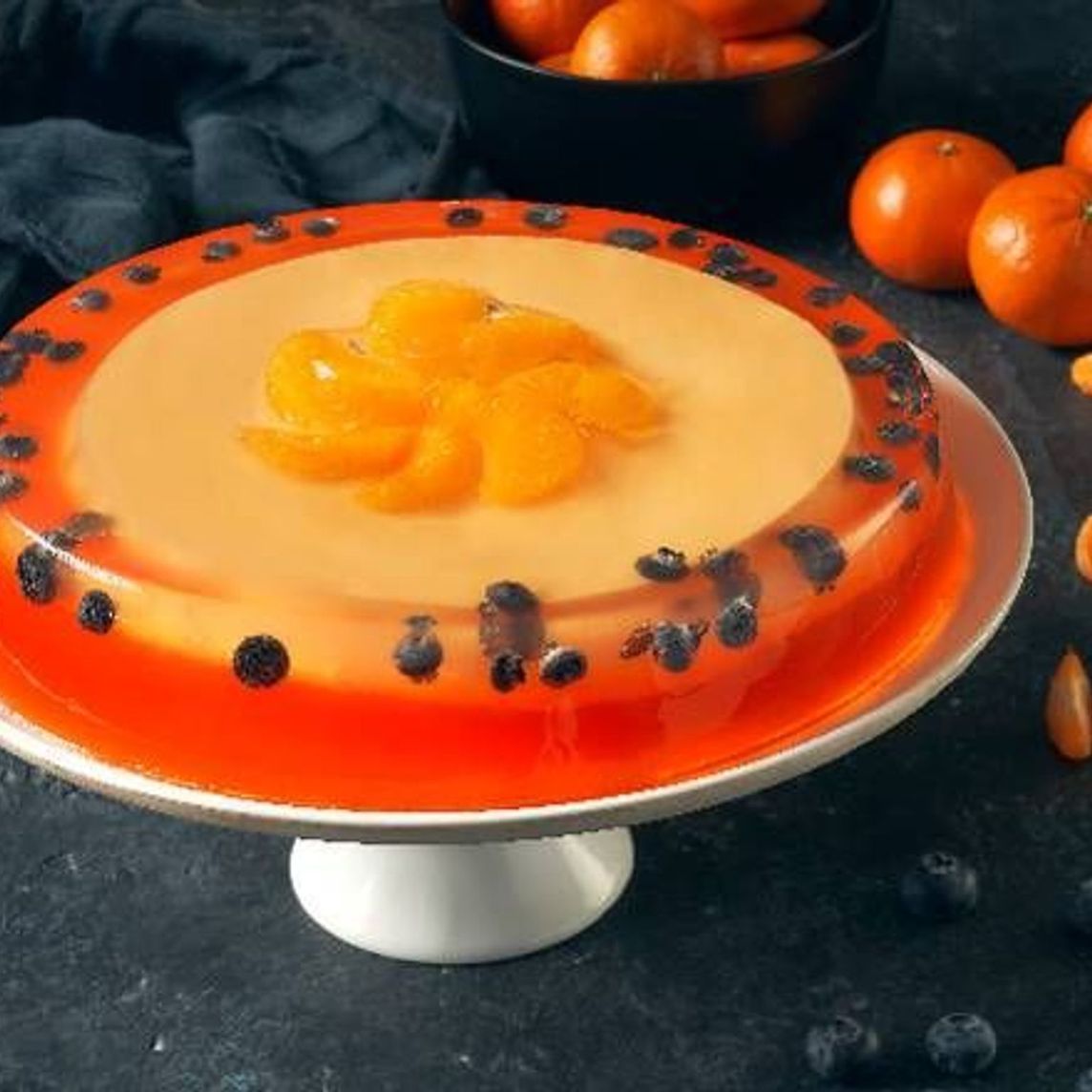 Fresca gelatina de mandarina, rellena de suave mousse de mandarina y decorada con mandarinas y cereza negra.