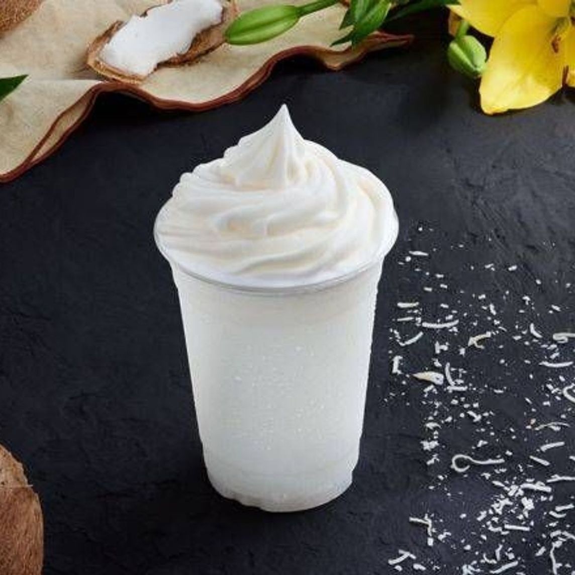 Frappe sabor coco, con una consistencia cremosa, decorada con crema batida.