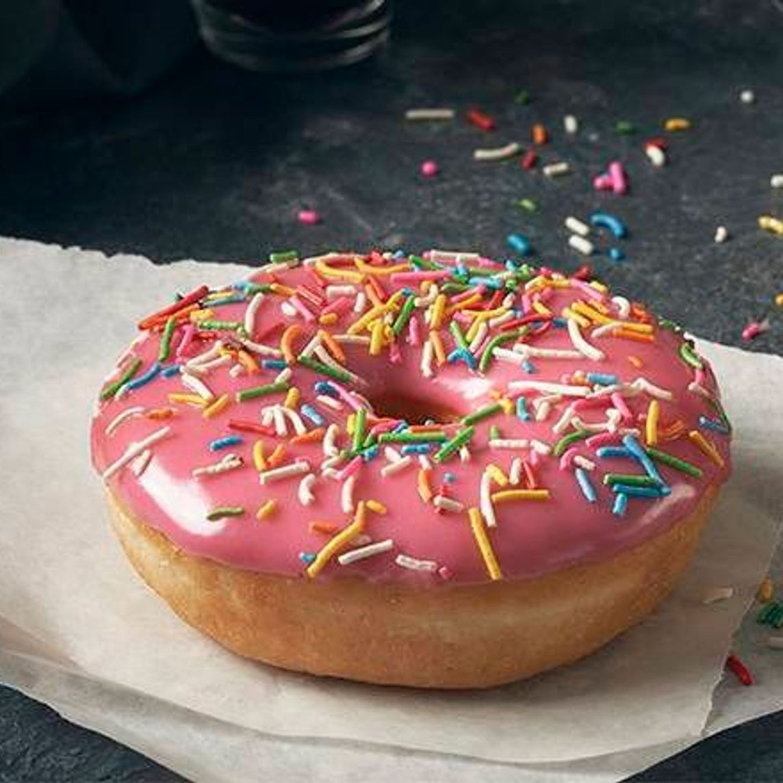 Dona francesa de vainilla decorada con sabroso fondant rosa y granillo de colores.