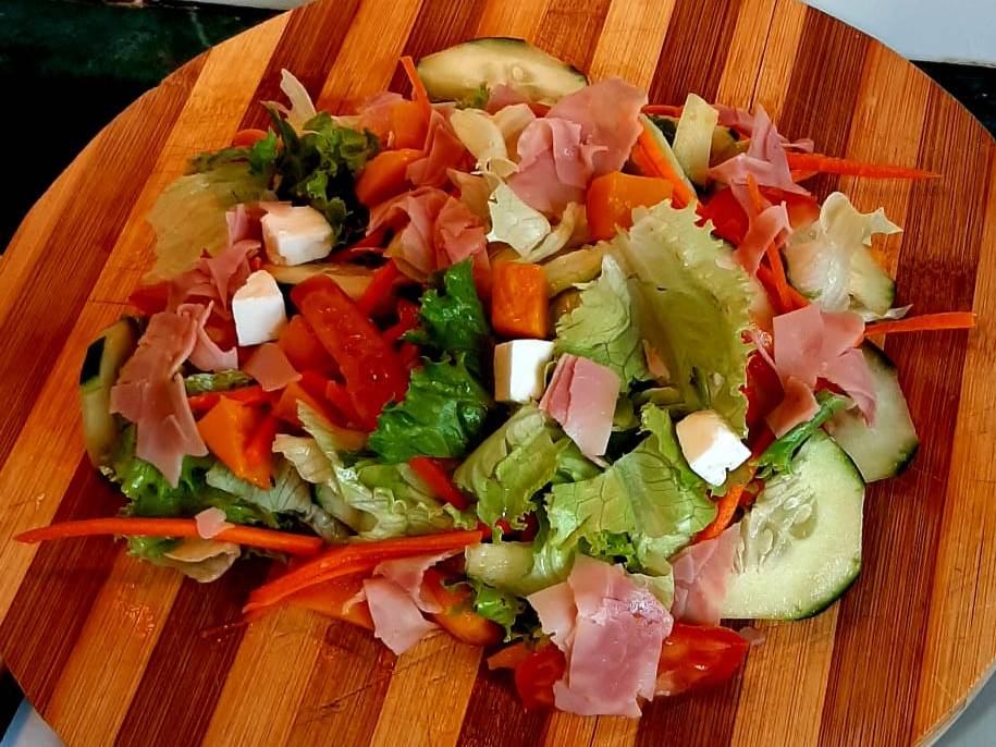 Buena porción de ensalada creada con una mezcla de lechugas, zanahoria, pepino, jamón, queso blanco y fruta de temporada, ideal para acompañar tus platillos.
