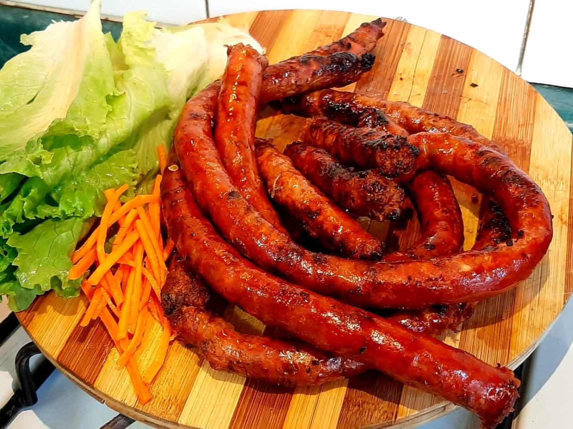 Deliciosa chistorra asada al carbón, acompañada de una porción de 500 gr. de puré de papa, ensalada verde, salsa de la casa y tortillas de maíz.