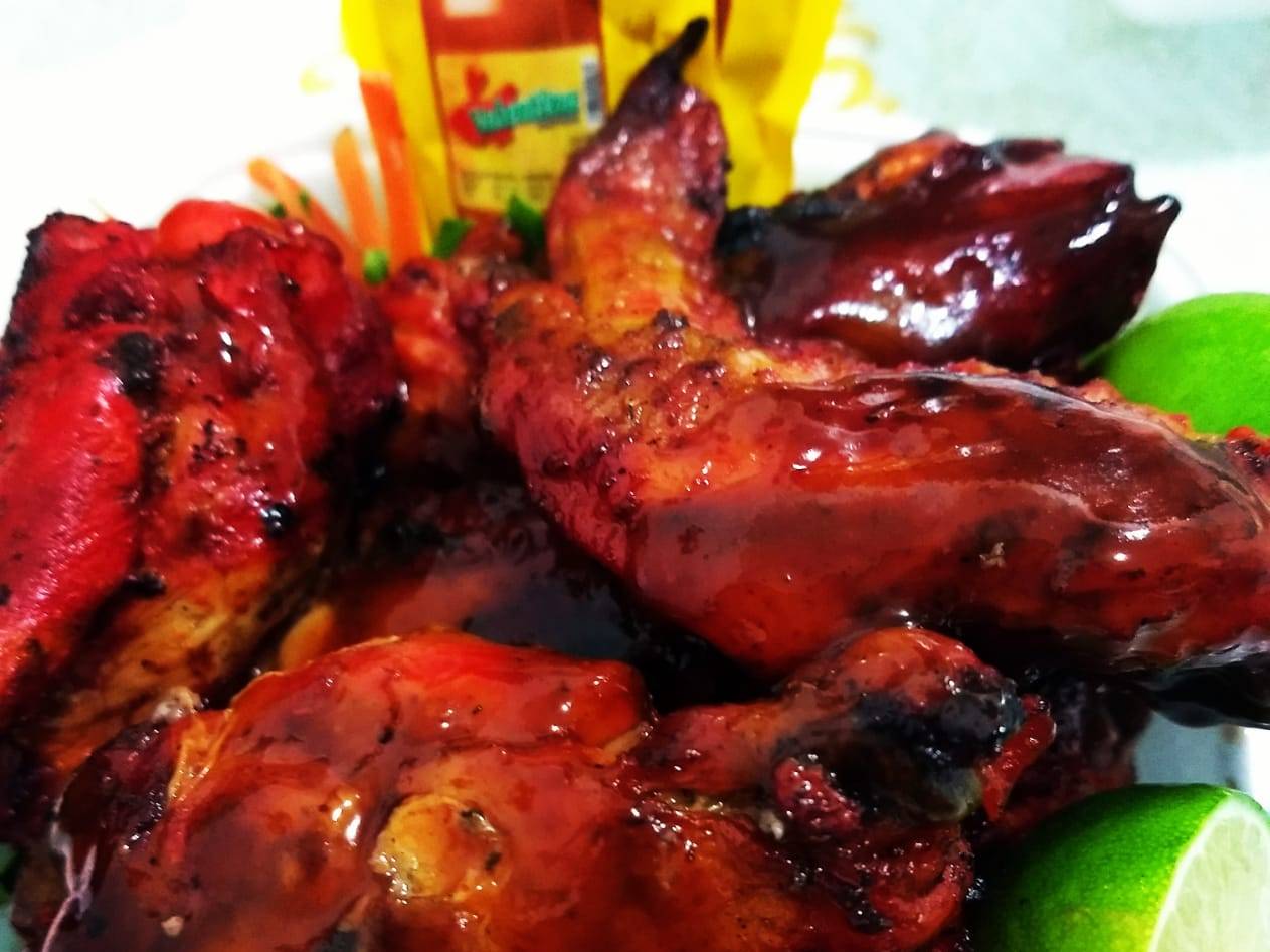 Deliciosas y suaves alitas de pollo al carbón bañadas en salsa BBQ.