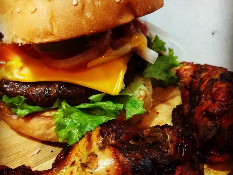 Hamburguesa al carbón de jugosa carne sirloin, acompañada de queso amarillo, tocino y 3 suaves y jugosas alitas bañadas en salsa BBQ.