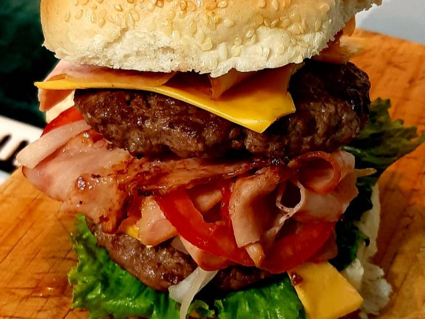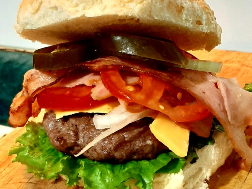 Hamburguesa al carbón de jugosa carne sirloin, acompañada de queso amarillo y tocino.