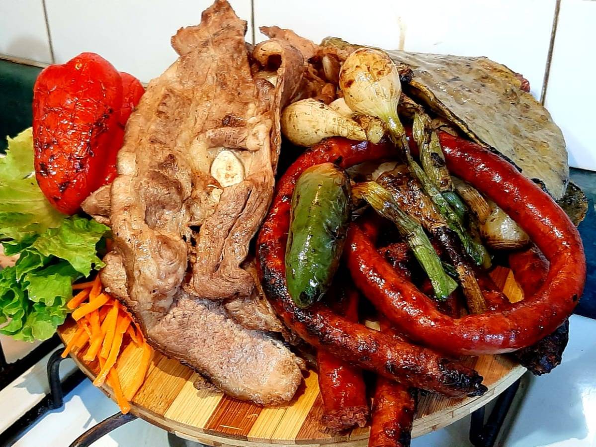 Deliciosa selección de costilla de res, aguja norteña, arrachera y chistorra, acompañada de 3 chiles morrones rellenos de queso asadero, nopales, cebollitas cambray, chile cuaresmeño, salsa de la casa y tortillas de maíz, todo asado al carbón y con la mejor calidad de carne de Sonora MX.