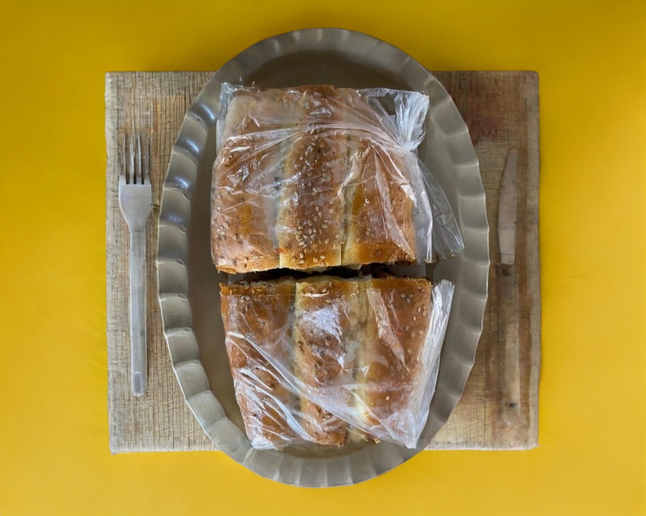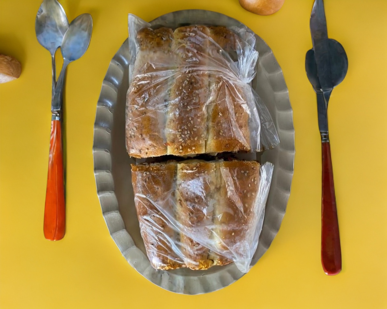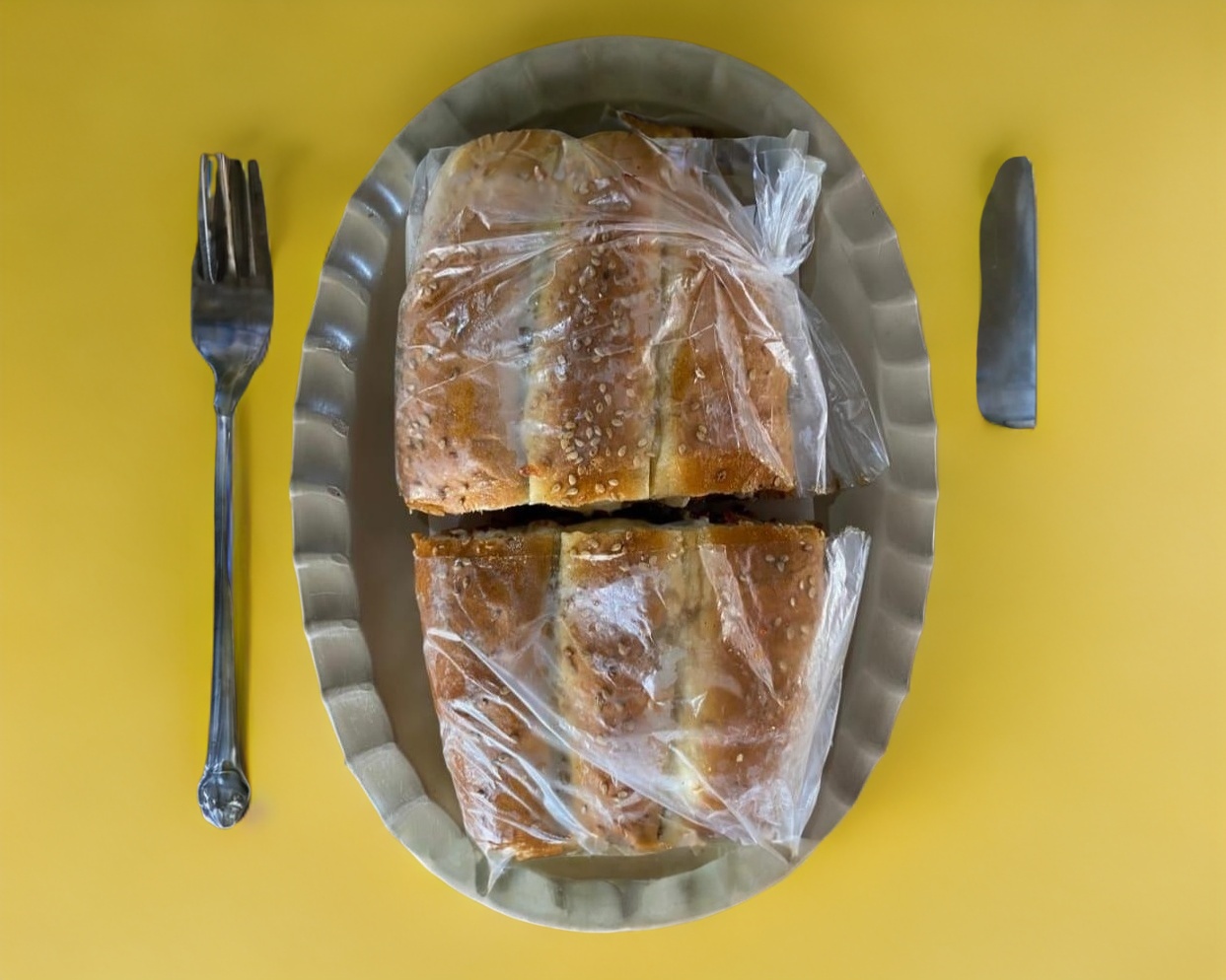 Torta de pastor con quesillo y piña, acompañada de verduras por aparte (cebolla, cilantro y salsas).
