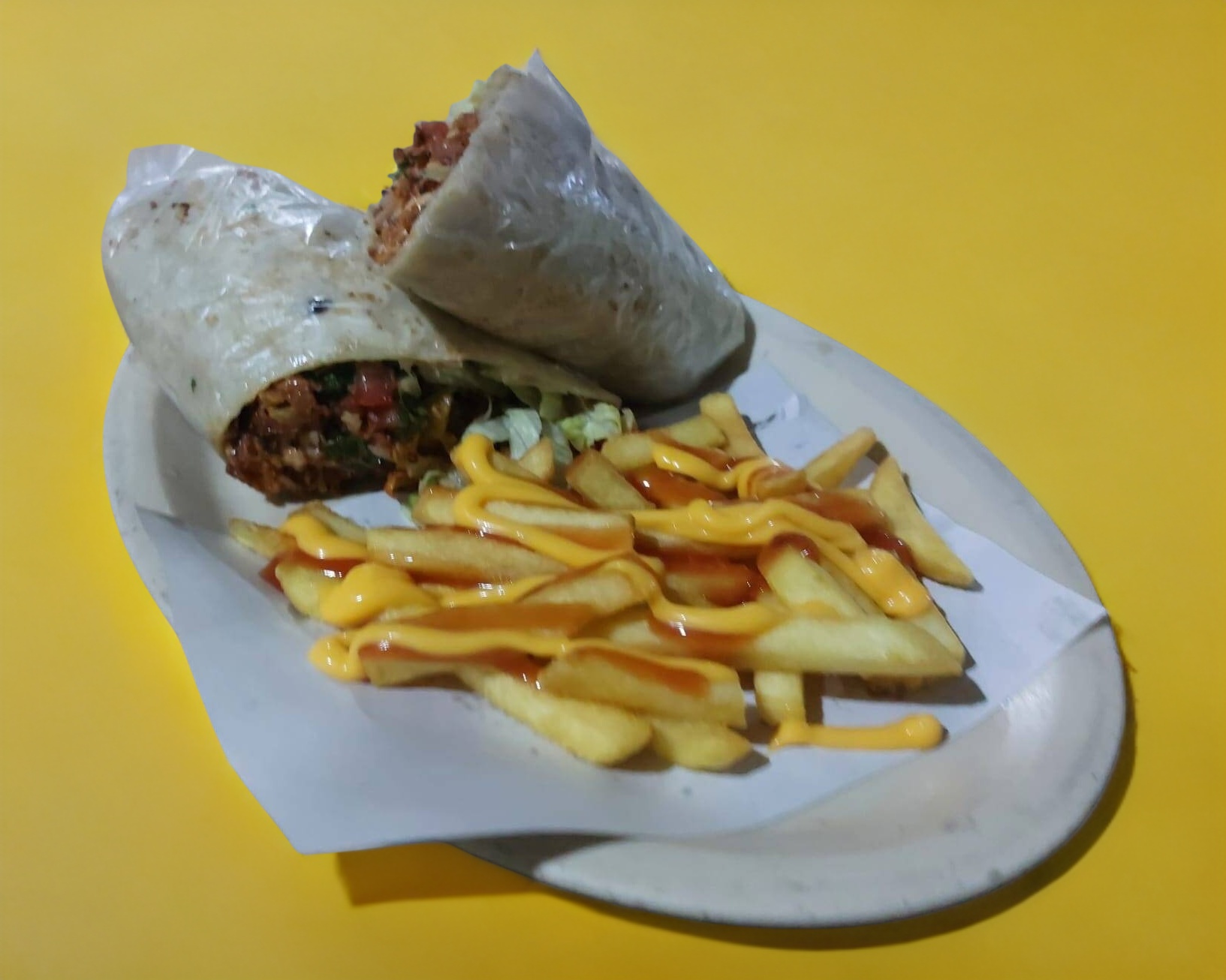 Burrito de Pastor con papas (individual): pastor con quesillo, piña, lechuga, cebolla, cilantro, jitomate, crema y frijoles, todo preparado.
