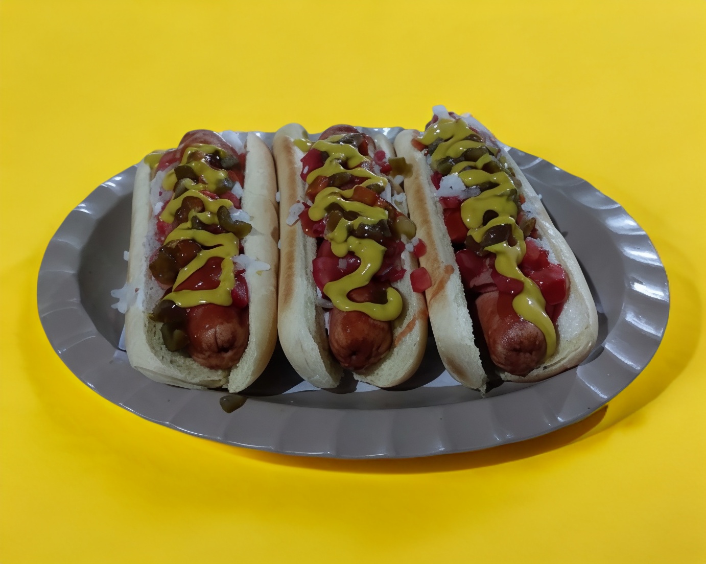 Tres piezas de hot dogs, cátsup, mostaza, cebolla, jitomate, chile