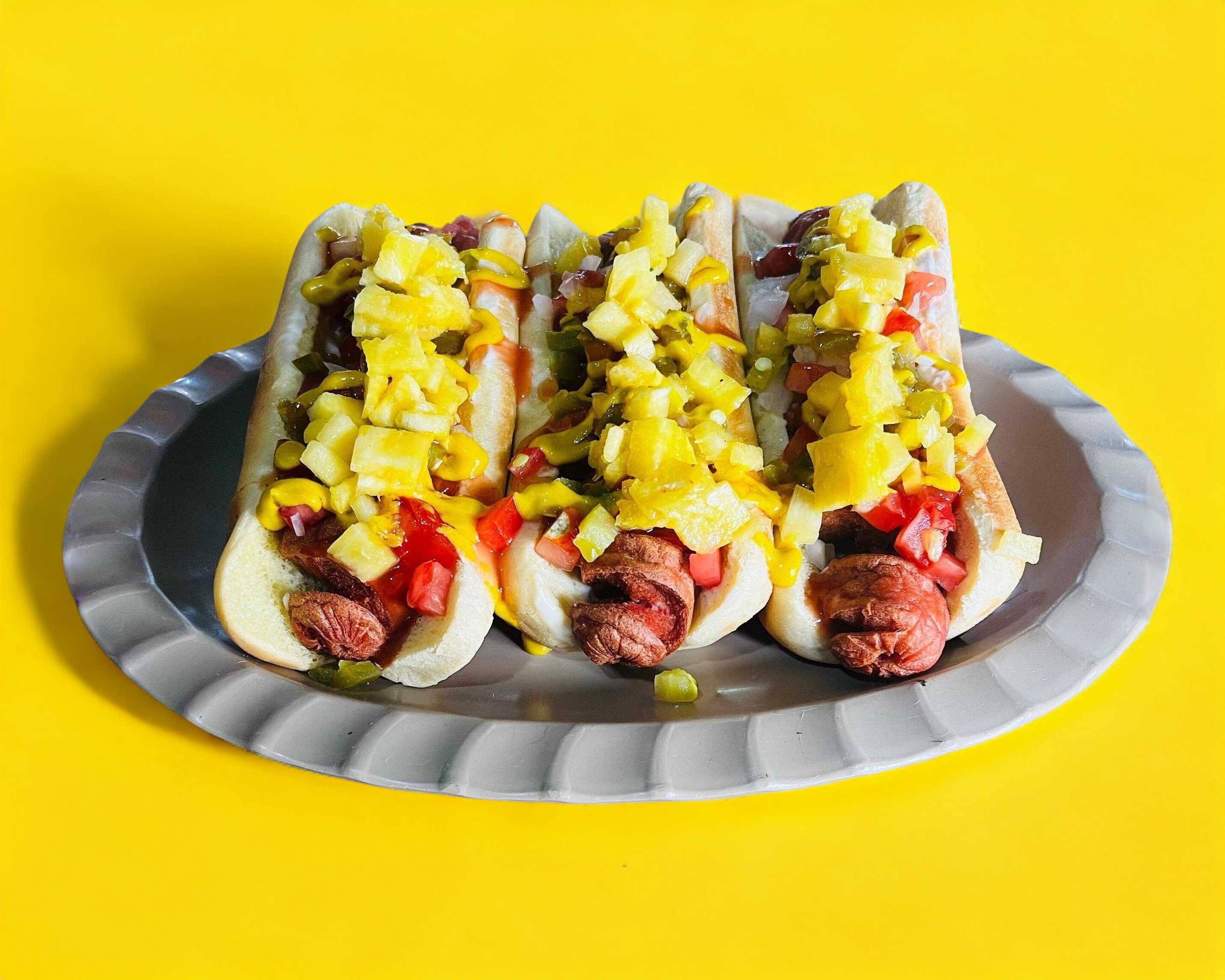 Tres piezas de hot dogs, jamón, piña, cátsup, mostaza, cebolla, jitomate, chile