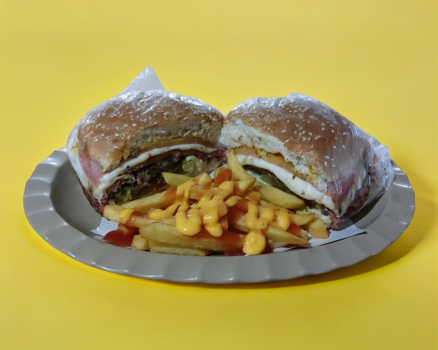 Dos carnes de res, quesillo, piña, jamón, lechuga, jitomate, cebolla, pepinillos, rajas, cátsup, mostaza, mayonesa