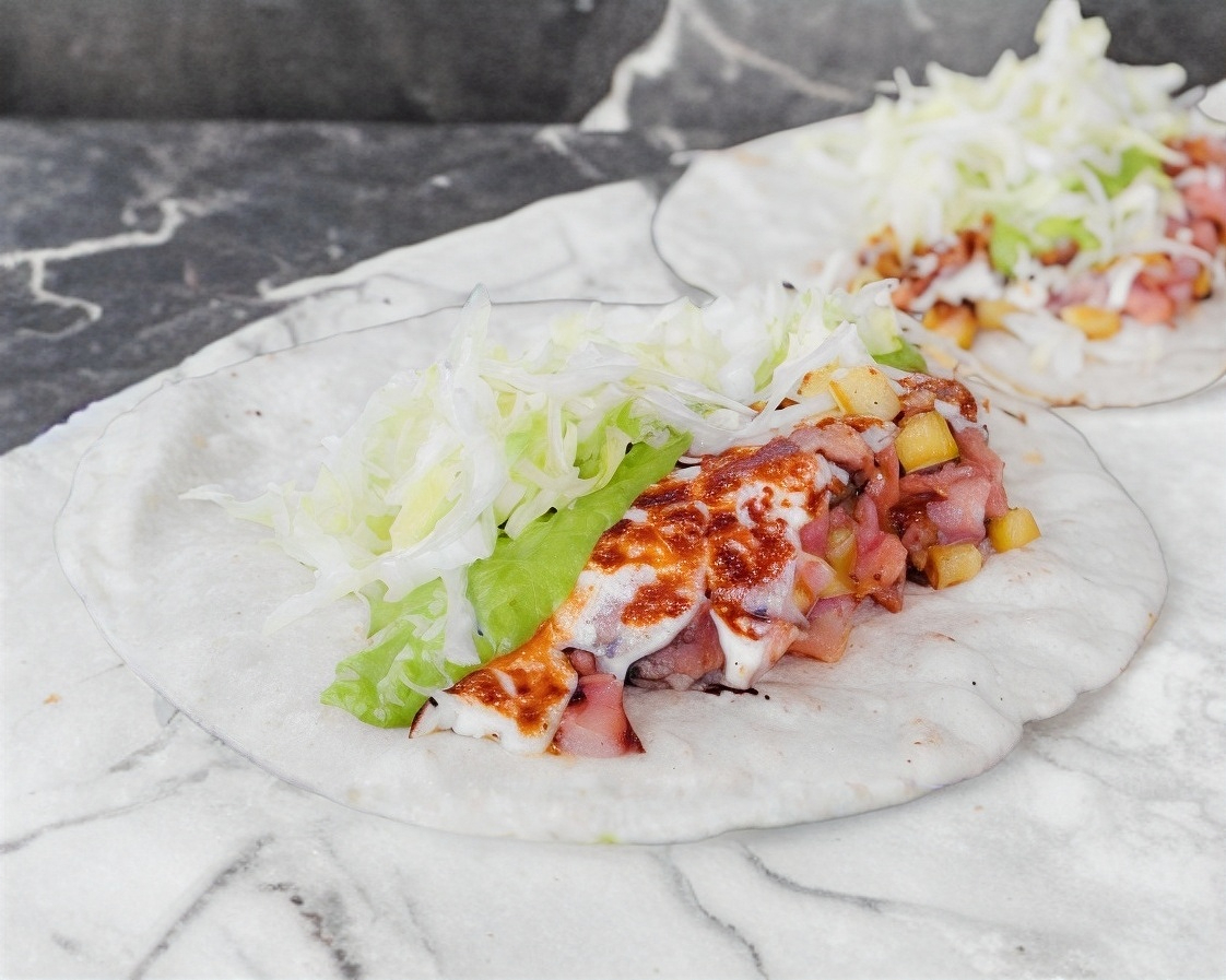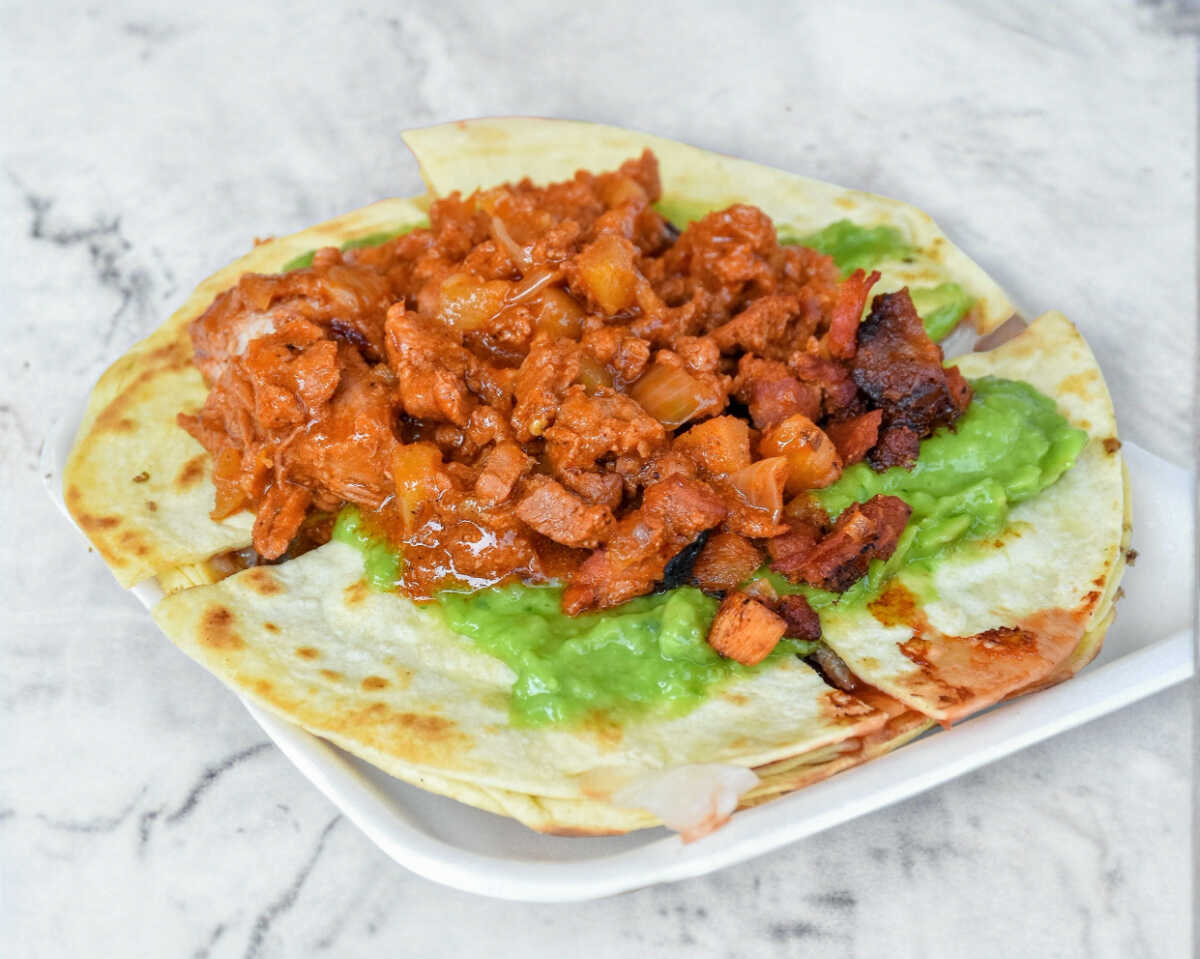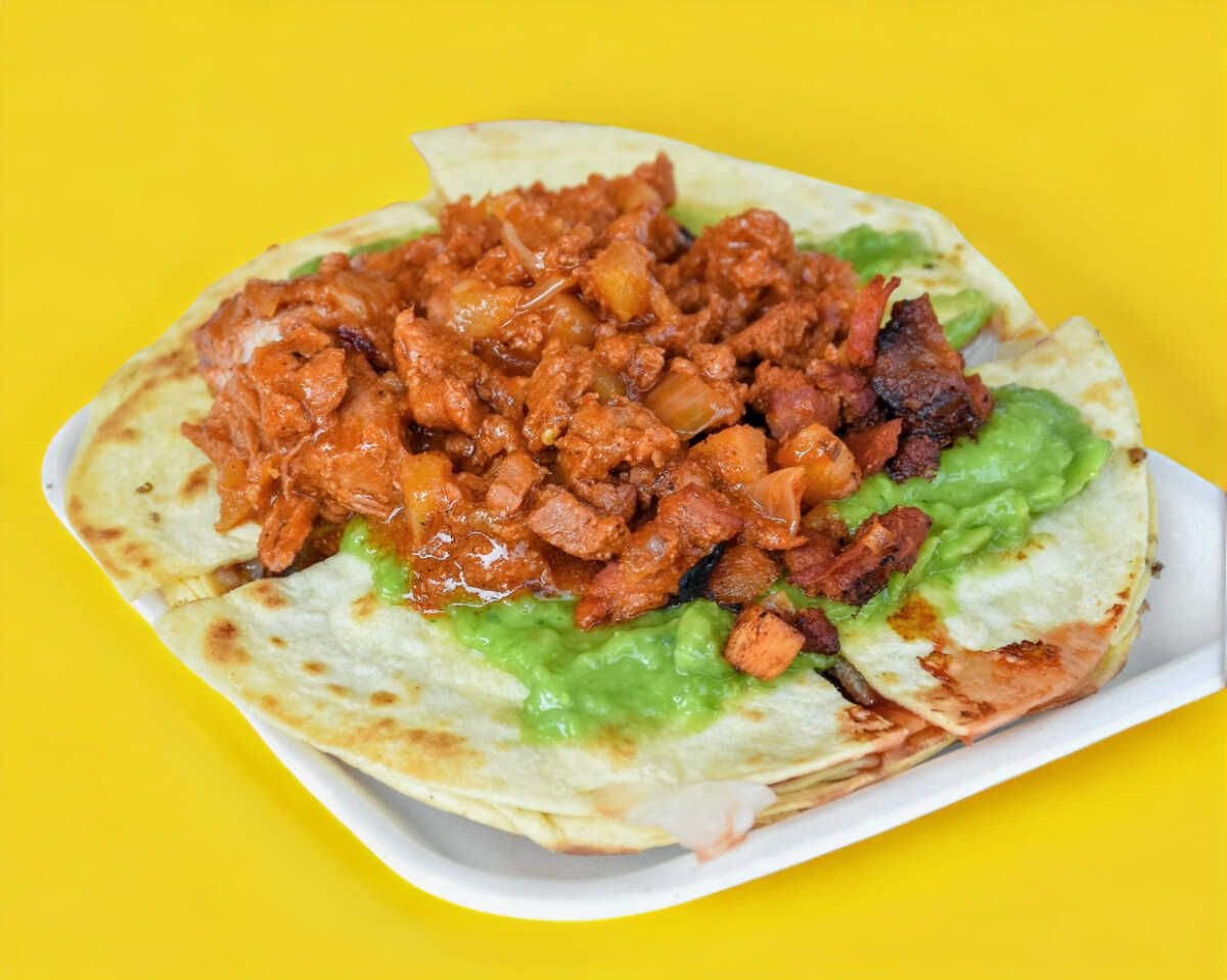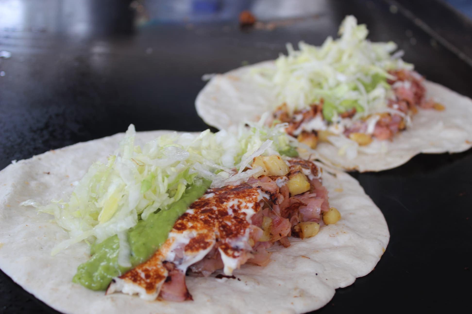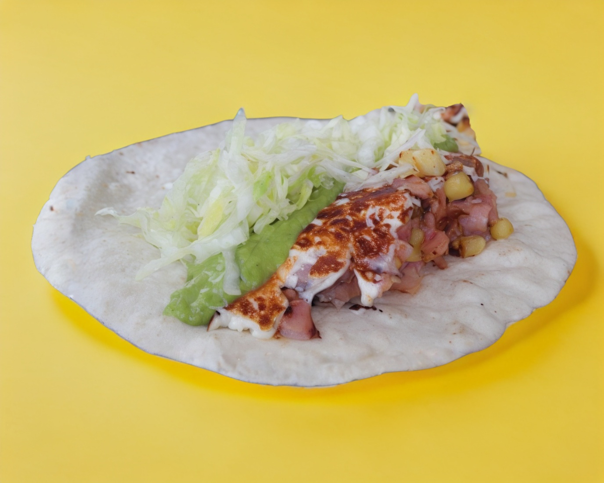 Tortillas de harina, jamón, queso amarillo, queso manchego, pastor, lechuga, cátsup y jitomate.
