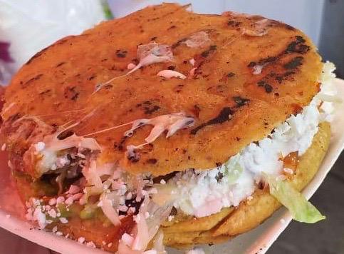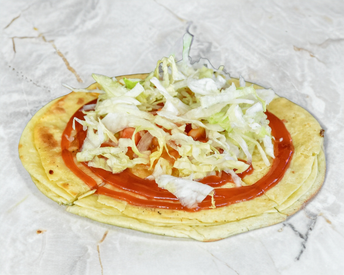 Base de masa de maíz rellena de chicharrón prensado con lechuga, crema ,queso rallado y queso Oaxaca. (porcion personal)