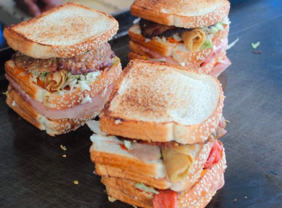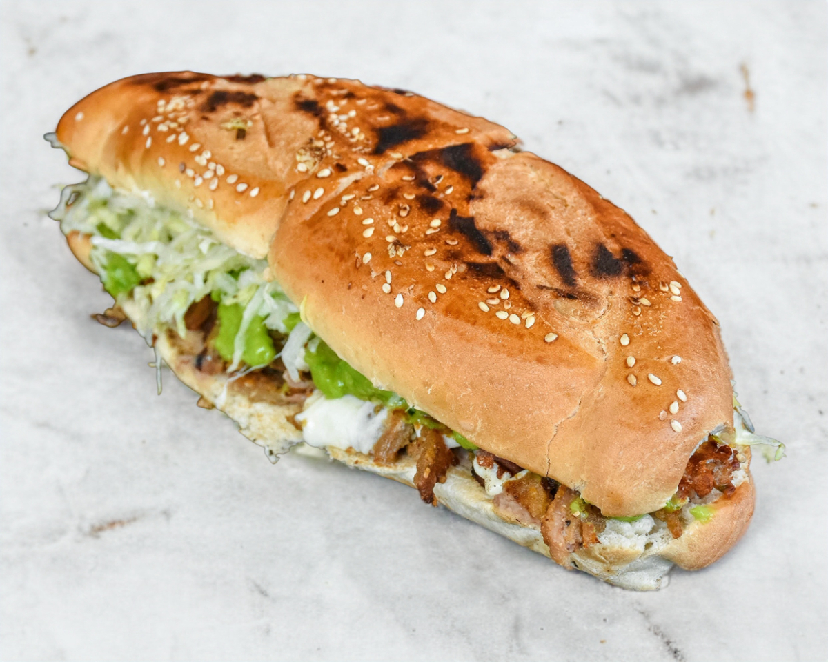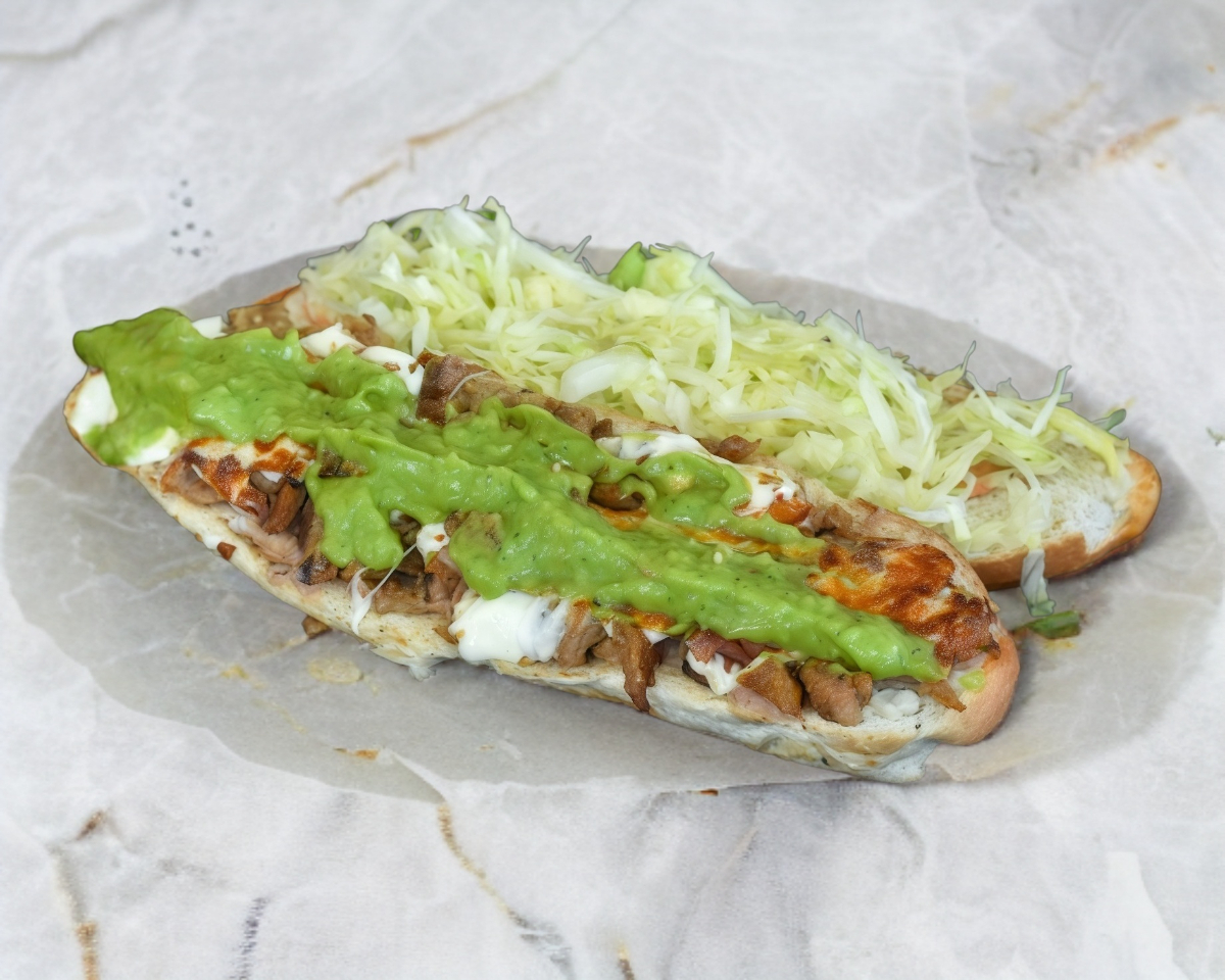 Con 5 panes, jamón, queso amarillo, queso manchego, mayonesa, frijoles, tinga, salchicha, taco dorado, carne de hamburguesa y lechuga.