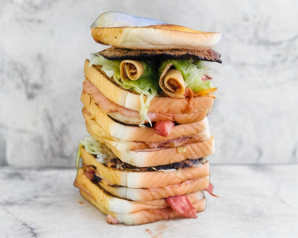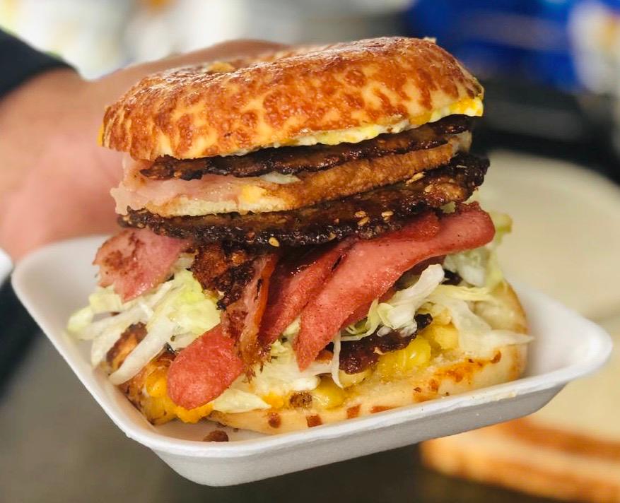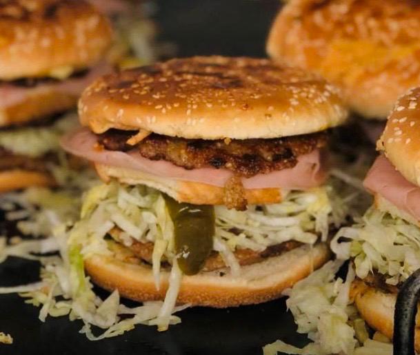Hamburguesa triple de con jamón, tocino, salchicha, cátsup, mostaza y guacamole