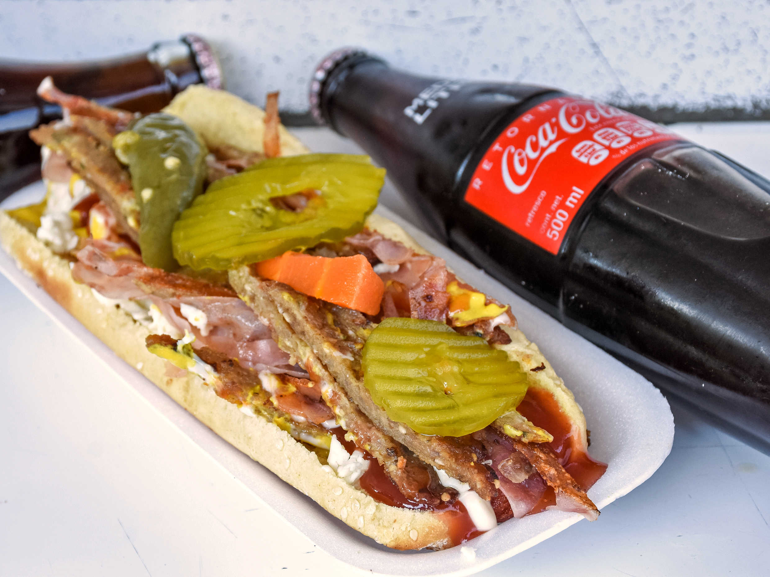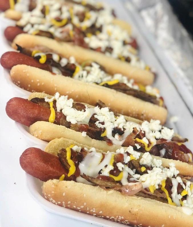 Pan extra grande, salchicha, carne con jamón, cátsup, mostaza, mayonesa y jitomate.